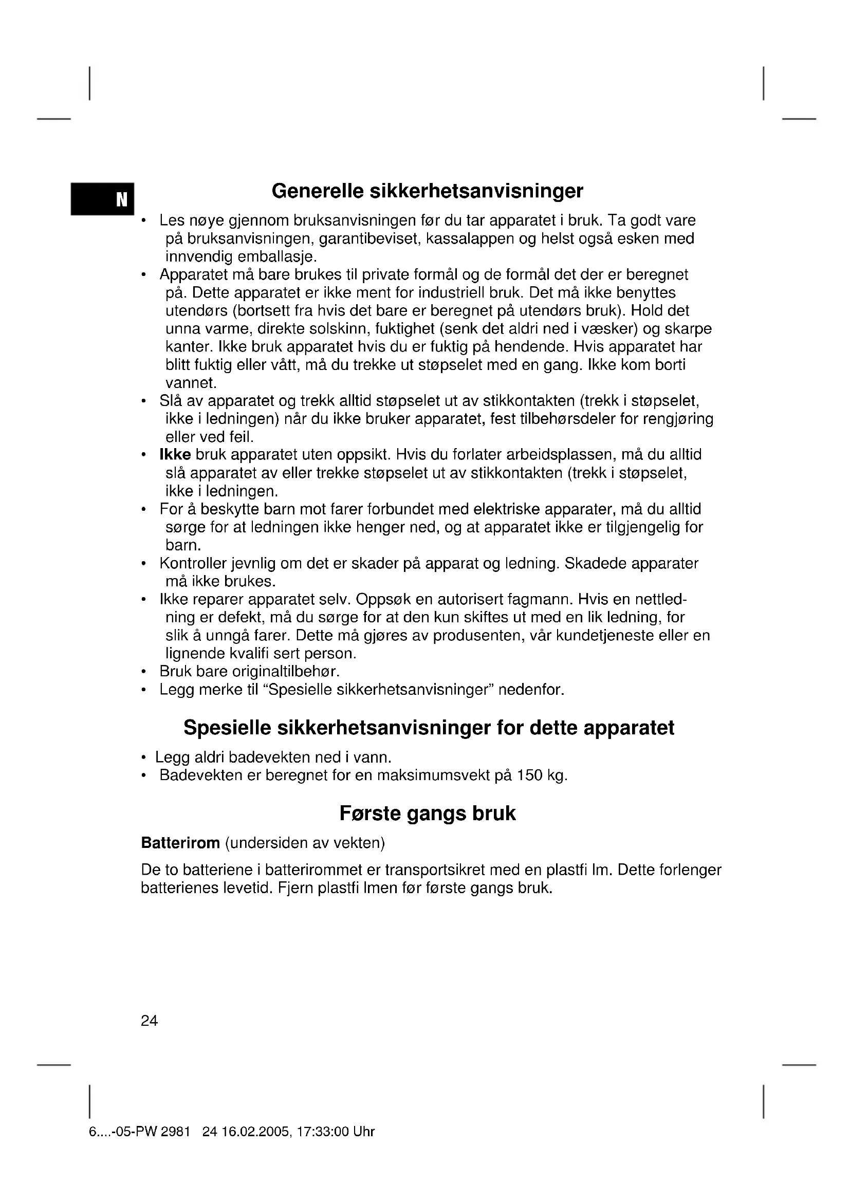 - Badevekten er beregnet for en maksimumsvekt på 150 kg. Første gangs bruk Batterirom (undersiden av vekten) De to batteriene i batterirommet er transportsikret med en plastfi lm. Dette forlenger batterienes levetid. Fjern plastfi lmen før første gangs bruk. 6....-05-PW 2981 24 16.02.2005, 17:33:00 UhrN