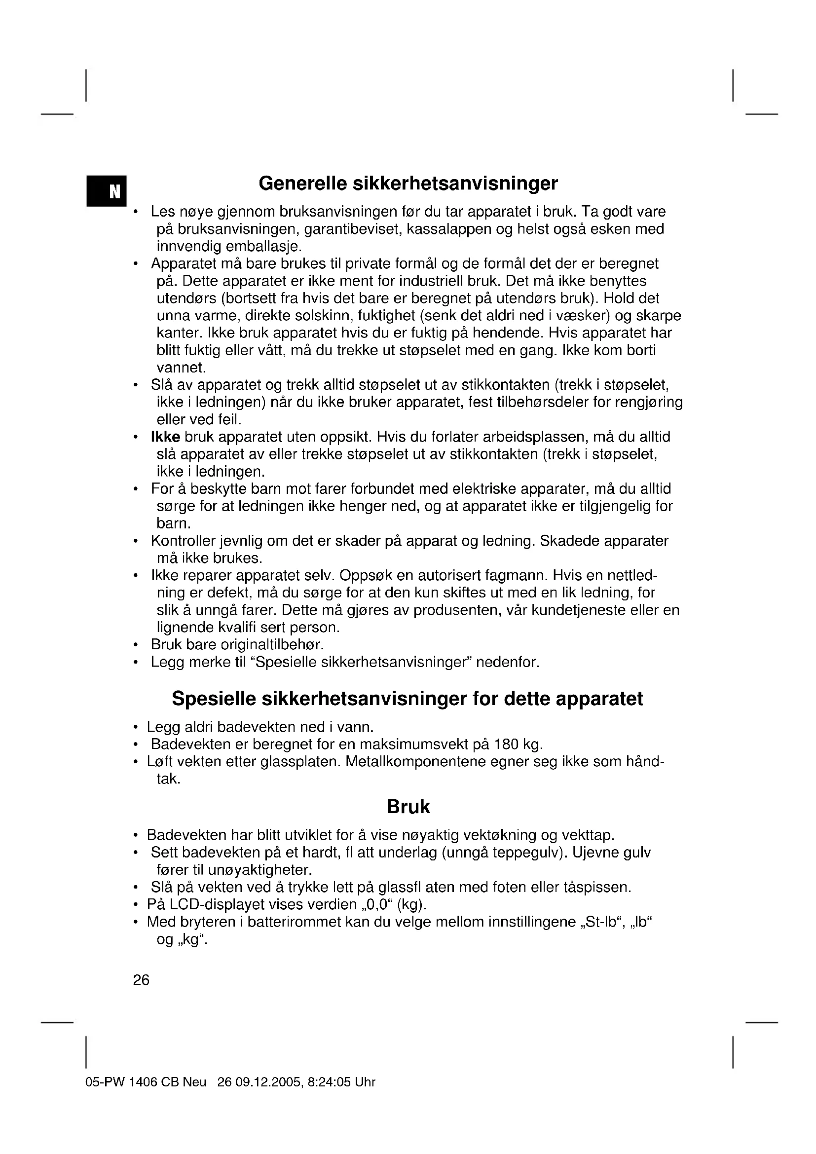 - Apparatet må bare brukes til private formål og de formål det der er beregnet på. Dette apparatet er ikke ment for industriell bruk. Det må ikke benyttes utendørs (bortsett fra hvis det bare er beregnet på utendørs bruk). Hold det unna varme, direkte solskinn, fuktighet (senk det aldri ned i væsker) og skarpe kanter. Ikke bruk apparatet hvis du er fuktig på hendende. Hvis apparatet har blitt fuktig eller vätt, må du trekke ut stopselet med en gang. Ikke kom borti vannet.