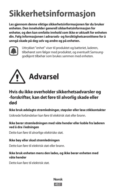 Sikkerhetsinformasjon Les gjennom denne viktige sikkerhetsinformasjonen før du bruker enheten. Den inneholder generell sikkerhetsinformasjon for enheter, og den kan omfatte innhold som ikke er aktuelt for enheten din. Følg informasjonen i advarsels- og forsiktighetsavsnittene for å unngå skade på deg selv og andre og på enheten. Uttrykket "enhet" viser til produktet og batteriet, laderen, tilbehøret som følger med produktet, og eventuelt Samsunggodkjent tilbehør som brukes sammen med enheten. Advarsel Hvis du ikke overholder sikkerhetsadvarsler og -forskrifter, kan det føre til alvorlig skade eller død Ikke bruk ødelagte strømledninger, støpsler eller løse stikkontakter Usikrede forbindelser kan føre til elektrisk støt eller brann. Ikke berør strømledningen med våte hender eller koble fra laderen ved å dra i ledningen Dette kan føre til alvorlige elektriske støt. Ikke bøy eller skad strømledningen Dette kan føre til elektrisk støt eller brann. Ikke bruk enheten mens den lades, og ikke berør enheten med våte hender Dette kan føre til elektrisk støt. Norsk