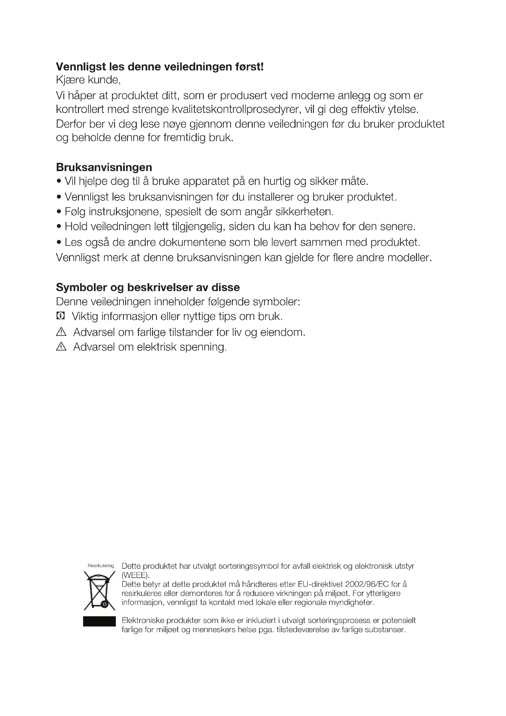 - Les også de andre dokumentene som ble levert sammen med produktet. Vennligst merk at denne bruksanvisningen kan gjelde for flere andre modeller. Symboler og beskrivelser av disse Denne veiledningen inneholder følgende symboler: C Viktig informasjon eller nyttige tips om bruk. A Advarsel om farlige tilstander for liv og eiendom. B Advarsel om elektrisk spenning. Dette produktet har utvalgt sorteringssymbol for avfall elektrisk og elektronisk utstyr (WEEE). Dette betyr at dette produktet må håndteres etter EU-direktivet 2002/96/EC for å resirkuleres eller demonteres for å redusere virkningen på miljøet. For ytterligere informasjon, vennligst ta kontakt med lokale eller regionale myndigheter. Elektroniske produkter som ikke er inkludert i utvalgt sorteringsprosess er potensielt farlige for miljøet og menneskers helse pga. tilstedeværelse av farlige substanser. ResirkuleringNO