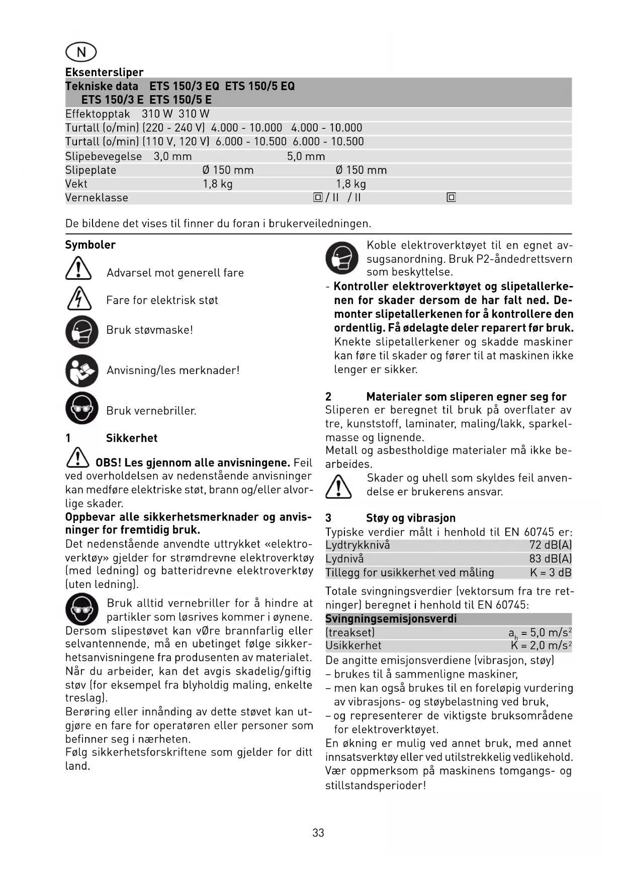 Effektopptak 310 W 310 W Turtall (o/min) (220 - 240 V) 4.000 - 10.000 4.000 - 10.000 Turtall (o/min) (110 V, 120 V) 6.000 - 10.500 6.000 - 10.500 Slipebevegelse 3,0 mm 5,0 mm Slipeplate Ø 150 mm Ø 150 mm Vekt 1,8 kg 1,8 kg Verneklasse / II / II De bildene det vises til fi nner du foran i brukerveiledningen. Symboler Advarsel mot generell fare Fare for elektrisk støt Bruk støvmaske! Anvisning/les merknader! Bruk vernebriller. 1 Sikkerhet OBS! Les gjennom alle anvisningene. Feil ved overholdelsen av nedenstående anvisninger kan medføre elektriske støt, brann og/eller alvor- lige skader. Oppbevar alle sikkerhetsmerknader og anvis- ninger for fremtidig bruk. Det nedenstående anvendte uttrykket «elektro- verktøy» gjelder for strømdrevne elektroverktøy (med ledning) og batteridrevne elektroverktøy (uten ledning). Bruk alltid vernebriller for å hindre at partikler som løsrives kommer i øynene. Dersom slipestøvet kan vØre brannfarlig eller selvantennende, må en ubetinget følge sikker- hetsanvisningene fra produsenten av materialet. Når du arbeider, kan det avgis skadelig/giftig støv (for eksempel fra blyholdig maling, enkelte treslag). Berøring eller innånding av dette støvet kan ut- gjøre en fare for operatøren eller personer som befi nner seg i nærheten. Følg sikkerhetsforskriftene som gjelder for ditt land. Koble elektroverktøyet til en egnet av- sugsanordning. Bruk P2-åndedrettsvern som beskyttelse. - Kontroller elektroverktøyet og slipetallerke- nen for skader dersom de har falt ned. De- monter slipetallerkenen for å kontrollere den ordentlig. Få ødelagte deler reparert før bruk. Knekte slipetallerkener og skadde maskiner kan føre til skader og fører til at maskinen ikke lenger er sikker. 2 Materialer som sliperen egner seg for Sliperen er beregnet til bruk på overfl ater av tre, kunststoff, laminater, maling/lakk, sparkel- masse og lignende. Metall og asbestholdige materialer må ikke be- arbeides. Skader og uhell som skyldes feil anven- delse er brukerens ansvar. 3 Støy og vibrasjon Typiske verdier målt i henhold til EN 60745 er: Lydtrykknivå 72 dB(A) Lydnivå 83 dB(A) Tillegg for usikkerhet ved måling K = 3 dB Totale svingningsverdier (vektorsum fra tre ret- ninger) beregnet i henhold til EN 60745: Svingningsemisjonsverdi (treakset) a