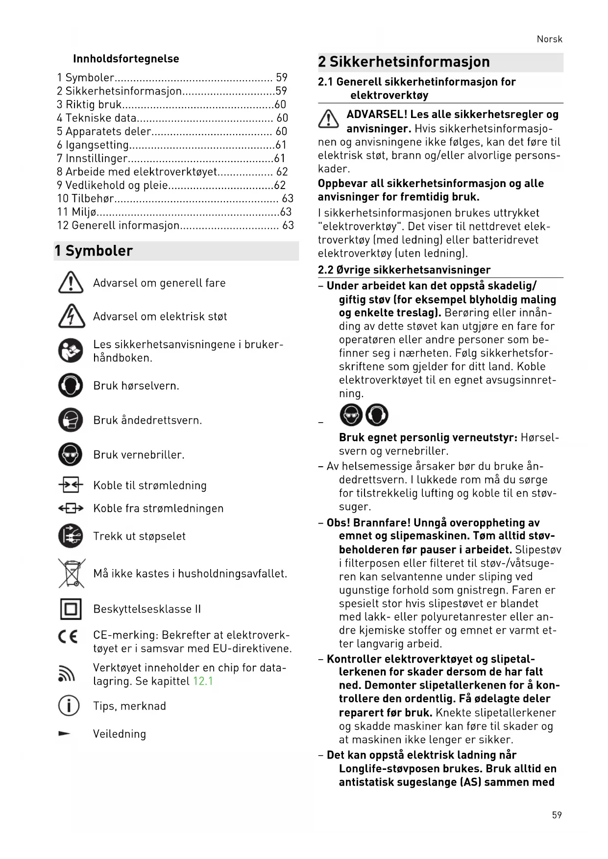 Bruk egnet personlig verneutstyr: Hørsel svern og vernebriller. – Av helsemessige årsaker bør du bruke ån dedrettsvern. I lukkede rom må du sørge for tilstrekkelig lufting og koble til en støv suger. – Obs! Brannfare! Unngå overoppheting av emnet og slipemaskinen. Tøm alltid støv beholderen før pauser i arbeidet. Slipestøv i filterposen eller filteret til støv-/våtsuge ren kan selvantenne under sliping ved ugunstige forhold som gnistregn. Faren er spesielt stor hvis slipestøvet er blandet med lakk- eller polyuretanrester eller an dre kjemiske stoffer og emnet er varmt et ter langvarig arbeid. – Kontroller elektroverktøyet og slipetal lerkenen for skader dersom de har falt ned. Demonter slipetallerkenen for å kon trollere den ordentlig. Få ødelagte deler reparert før bruk. Knekte slipetallerkener og skadde maskiner kan føre til skader og at maskinen ikke lenger er sikker. – Det kan oppstå elektrisk ladning når Longlife-støvposen brukes. Bruk alltid en antistatisk sugeslange (AS) sammen med Norsk 59elektroverktøyet. Lettere elektriske støt kan føre til at man skvetter og blir mindre oppmerksom, noe som kan forårsake ulyk ker. – Rengjør arbeidsutstyr som er fuktet med olje, som for eksempel slipeklosser eller polerfilt, med vann, og tørke atskilt fra hverandre. Arbeidsutstyr som er fuktet med olje, kan selvantenne.