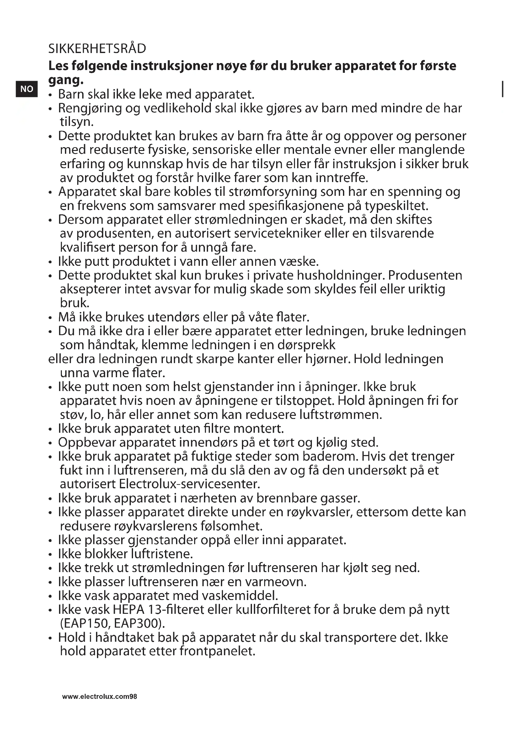 - Ikke bruk apparatet på fuktige steder som baderom. Hvis det trenger fukt inn i luftrenseren, må du slå den av og få den undersøkt på et autorisert Electrolux-servicesenter.