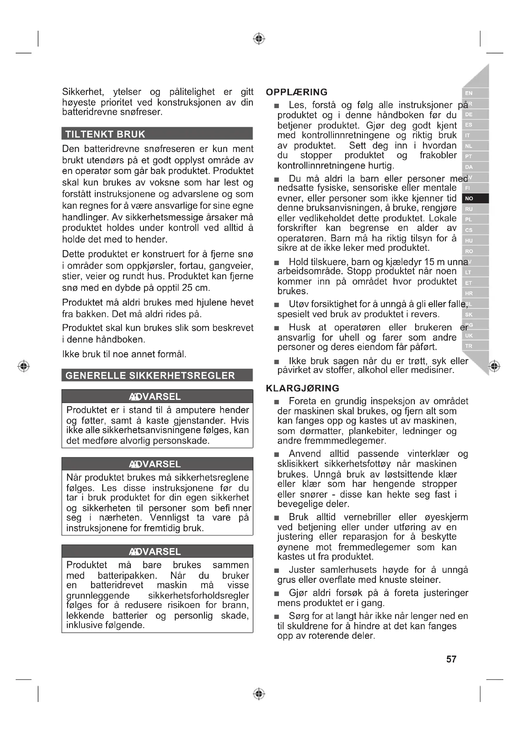 Den batteridrevne snøfreseren er kun ment brukt utendørs på et godt opplyst område av en operatør som går bak produktet. Produktet skal kun brukes av voksne som har lest og forstått instruksjonene og advarslene og som kan regnes for å være ansvarlige for sine egne handlinger. Av sikkerhetsmessige årsaker må produktet holdes under kontroll ved alltid å holde det med to hender.