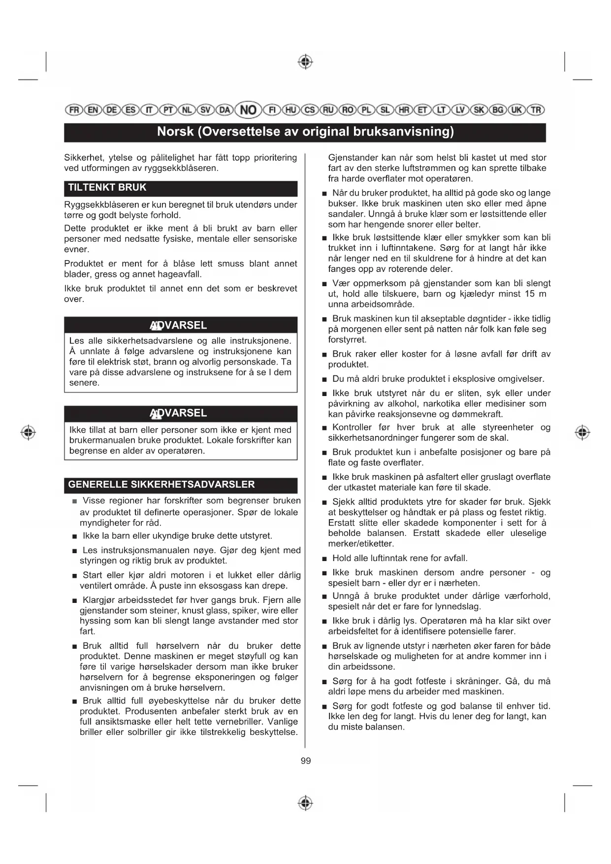 BEMÆRKNINGER: ■ Vedligeholdelsesarbejde skal udføres oftere, når produktet anvendes i støvede omgivelser. ■ Når produktet har overskredet de maksimale tal, der er angivet i tabellen, bør vedligeholdelse stadig gennemgå cyklusser i henhold til de tidsintervaller eller timer angivet heri.99 Norsk (Oversettelse av original bruksanvisning) Sikkerhet, ytelse og pålitelighet har fått topp prioritering ved utformingen av ryggsekkblåseren. TILTENKT BRUK Ryggsekkblåseren er kun beregnet til bruk utendørs under tørre og godt belyste forhold. Dette produktet er ikke ment å bli brukt av barn eller personer med nedsatte fysiske, mentale eller sensoriske evner. Produktet er ment for å blåse lett smuss blant annet blader, gress og annet hageavfall. Ikke bruk produktet til annet enn det som er beskrevet over. ADVARSEL Les alle sikkerhetsadvarslene og alle instruksjonene. Å unnlate å følge advarslene og instruksjonene kan føre til elektrisk støt, brann og alvorlig personskade. Ta vare på disse advarslene og instruksene for å se I dem senere. ADVARSEL Ikke tillat at barn eller personer som ikke er kjent med brukermanualen bruke produktet. Lokale forskrifter kan begrense en alder av operatøren. GENERELLE SIKKERHETSADVARSLER ■ Visse regioner har forskrifter som begrenser bruken av produktet til definerte operasjoner. Spør de lokale myndigheter for råd. ■ Ikke la barn eller ukyndige bruke dette utstyret. ■ Les instruksjonsmanualen nøye. Gjør deg kjent med styringen og riktig bruk av produktet. ■ Start eller kjør aldri motoren i et lukket eller dårlig ventilert område. Å puste inn eksosgass kan drepe. ■ Klargjør arbeidsstedet før hver gangs bruk. Fjern alle gjenstander som steiner, knust glass, spiker, wire eller hyssing som kan bli slengt lange avstander med stor fart. ■ Bruk alltid full hørselvern når du bruker dette produktet. Denne maskinen er meget støyfull og kan føre til varige hørselskader dersom man ikke bruker hørselvern for å begrense eksponeringen og følger anvisningen om å bruke hørselvern. ■ Bruk alltid full øyebeskyttelse når du bruker dette produktet. Produsenten anbefaler sterkt bruk av en full ansiktsmaske eller helt tette vernebriller. Vanlige briller eller solbriller gir ikke tilstrekkelig beskyttelse. Gjenstander kan når som helst bli kastet ut med stor fart av den sterke luftstrømmen og kan sprette tilbake fra harde overflater mot operatøren. ■ Når du bruker produktet, ha alltid på gode sko og lange bukser. Ikke bruk maskinen uten sko eller med åpne sandaler. Unngå å bruke klær som er løstsittende eller som har hengende snorer eller belter. ■ Ikke bruk løstsittende klær eller smykker som kan bli trukket inn i luftinntakene. Sørg for at langt hår ikke når lenger ned en til skuldrene for å hindre at det kan fanges opp av roterende deler. ■ Vær oppmerksom på gjenstander som kan bli slengt ut, hold alle tilskuere, barn og kjæledyr minst 15 m unna arbeidsområde. ■ Bruk maskinen kun til akseptable døgntider - ikke tidlig på morgenen eller sent på natten når folk kan føle seg forstyrret. ■ Bruk raker eller koster for å løsne avfall før drift av produktet. ■ Du må aldri bruke produktet i eksplosive omgivelser. ■ Ikke bruk utstyret når du er sliten, syk eller under påvirkning av alkohol, narkotika eller medisiner som kan påvirke reaksjonsevne og dømmekraft. ■ Kontroller før hver bruk at alle styreenheter og sikkerhetsanordninger fungerer som de skal. ■ Bruk produktet kun i anbefalte posisjoner og bare på flate og faste overflater. ■ Ikke bruk maskinen på asfaltert eller gruslagt overflate der utkastet materiale kan føre til skade. ■ Sjekk alltid produktets ytre for skader før bruk. Sjekk at beskyttelser og håndtak er på plass og festet riktig. Erstatt slitte eller skadede komponenter i sett for å beholde balansen. Erstatt skadede eller uleselige merker/etiketter. ■ Hold alle luftinntak rene for avfall. ■ Ikke bruk maskinen dersom andre personer - og spesielt barn - eller dyr er i nærheten. ■ Unngå å bruke produktet under dårlige værforhold, spesielt når det er fare for lynnedslag. ■ Ikke bruk i dårlig lys. Operatøren må ha klar sikt over arbeidsfeltet for å identifisere potensielle farer. ■ Bruk av lignende utstyr i nærheten øker faren for både hørselskade og muligheten for at andre kommer inn i din arbeidssone. ■ Sørg for å ha godt fotfeste i skråninger. Gå, du må aldri løpe mens du arbeider med maskinen. ■ Sørg for godt fotfeste og god balanse til enhver tid. Ikke len deg for langt. Hvis du lener deg for langt, kan du miste balansen.100 Norsk (Oversettelse av original bruksanvisning) ■ Du må aldri bruke produktet med ødelagte vern eller beskyttelser eller uten sikkerhetsanordninger, for eksempel hvis avfallsoppsamleren ikke er på plass. ■ Du må ikke endre maskinen på noe måte eller bruke deler og tilbehør som ikke er anbefalt brukt av produsenten. ADVARSEL Dersom produktet faller i bakken, får et sterkt slag eller starter å vibrere unormalt, stans produktet omgående og sjekk for skader eller fi nn ut hva som er årsaken for vibrasjonene. Enhver skade må reparere helt eller delen skiftes av et autorisert serviceverksted. ■ Ikke berør områdene rundt støydemper og motor på enheten idet disse kan bli meget varme under bruk. ■ Stopp motoren og la produktet kjøles ned før ny påfylling. ■ For påfylling og drivstoffblanding velg et område som er godt ventiler og på avstand fra tenningskilder, slik som gnister eller flammer, samt antennelige materialer. ■ Ikke røyk eller bruk åpen ild mens du blander eller fyller tanken med drivstoff. ■ Bland og oppbevar drivstoff i en beholder som er godkjent for drivstoff. ■ Hold et tilstrekkelig stort brannslukningsapparat nær stedet for å kunne slukke en eventuell drivstoffbrann. ■ Husk å sikre bensinstanklokket før oppstart av motoren. Kontroller at det ikke fin