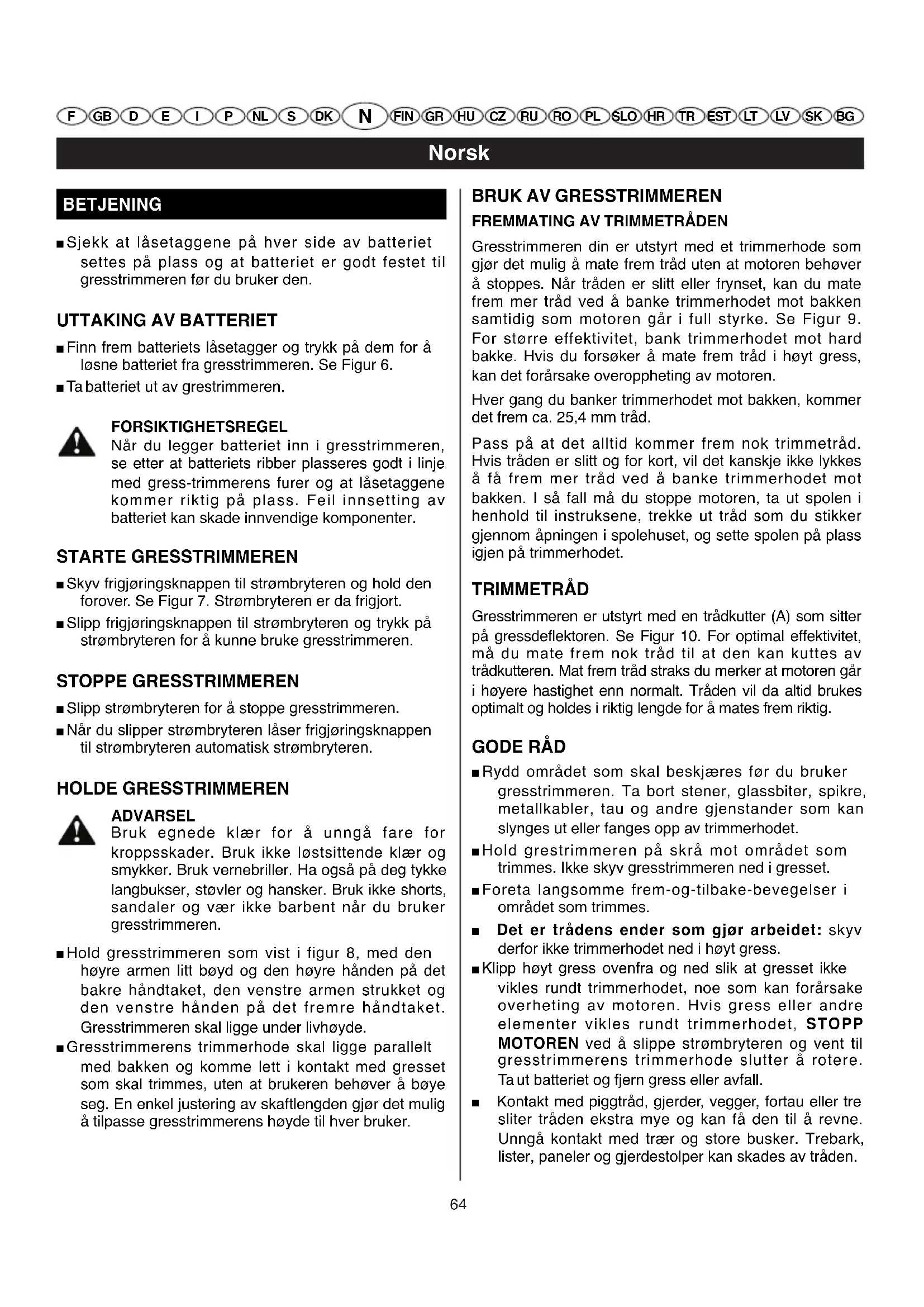 Bruk egnede klær for a unnga fare for kroppsskader. Bruk ikke løstsittende klær og smykker. Bruk vernebriller. Ha øgsa pa deg tykke langbukser, stovler og hansker. Bruk ikke shorts, sandaler og vær ikke barbent när du bruker gresstrimmeren.