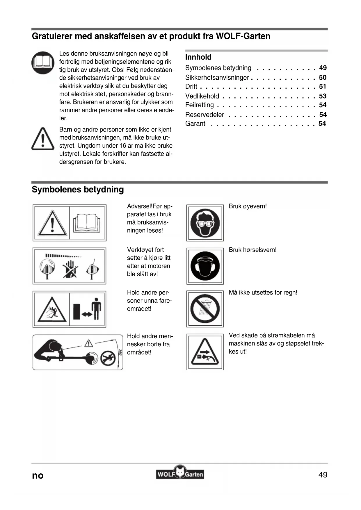 Symbolenes betydning 360°Les denne bruksanvisningen nøye og bli fortrolig med betjeningselementene og rik-tig bruk av utstyret. Obs! Følg nedenståen-de sikkerhetsanvisninger ved bruk av elektrisk verktøy slik at du beskytter deg mot elektrisk støt, personskader og brann-fare. Brukeren er ansvarlig for ulykker som rammer andre personer eller deres eiende- ler. Barn og andre personer som ikke er kjent med bruksanvisningen, må ikke bruke ut-styret. Ungdom under 16 år må ikke bruke utstyret. Lokale forskrifter kan fastsette al-dersgrensen for brukere.Advarsel!Før ap-paratet tas i bruk må bruksanvis-ningen leses!Verktøyet fort-setter å kjøre litt etter at motoren ble slått av!Hold andre per-soner unna fare-området!Hold andre men-nesker borte fra området!Bruk øyevern!Bruk hørselsvern!Må ikke utsettes for regn!Ved skade på strømkabelen må maskinen slås av og støpselet trek-kes ut! Originale driftsanvisningen - no50