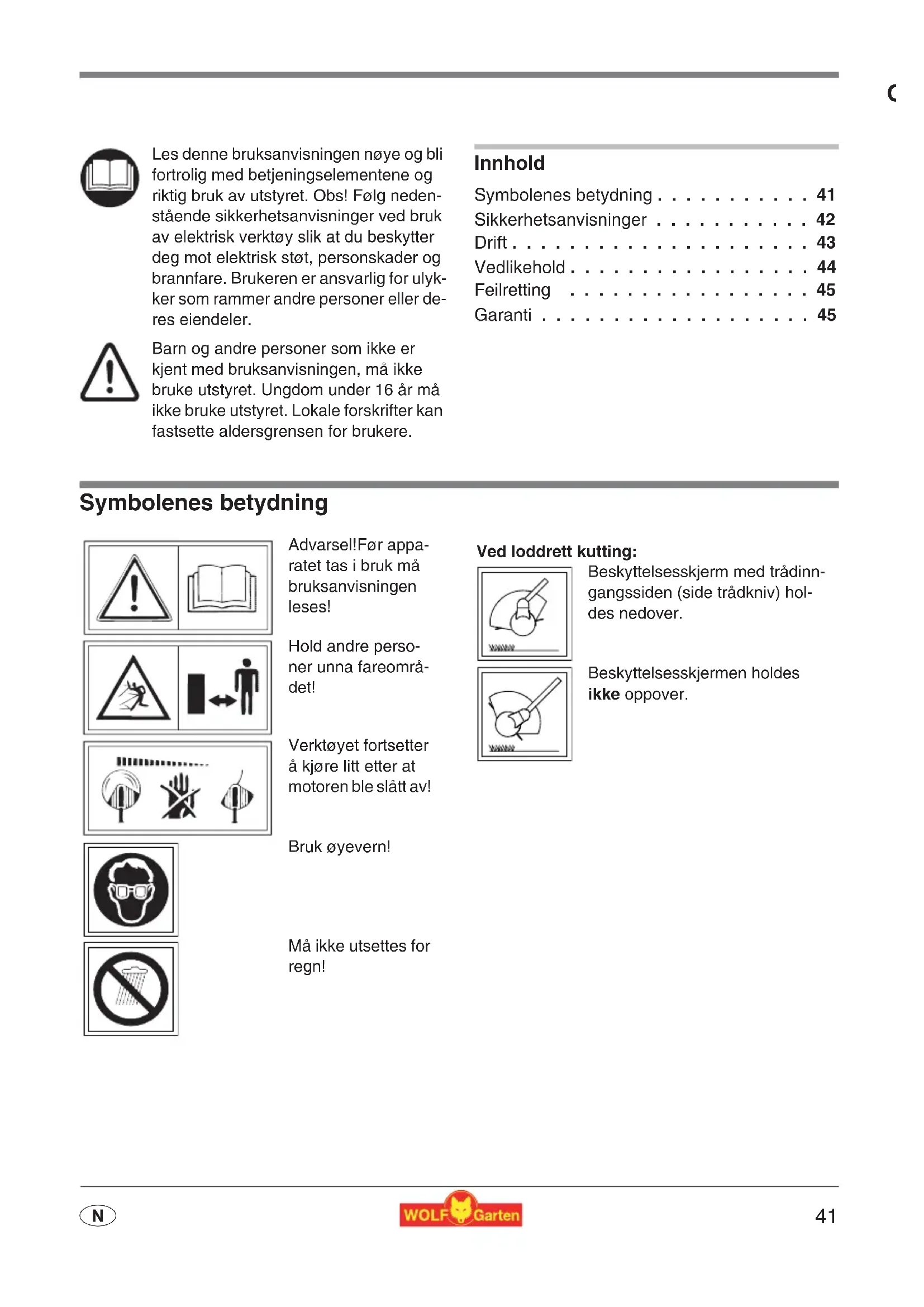 - Garanti Symbolenes betydning Les denne bruksanvisningen nøye og bli fortrolig med betjeningselementene og riktig bruk av utstyret. Obs! Følg neden- stående sikkerhetsanvisninger ved bruk av elektrisk verktøy slik at du beskytter deg mot elektrisk støt, personskader og brannfare. Brukeren er ansvarlig for ulyk- ker som rammer andre personer eller de- res eiendeler. Barn og andre personer som ikke er kjent med bruksanvisningen, må ikke bruke utstyret. Ungdom under 16 år må ikke bruke utstyret. Lokale forskrifter kan fastsette aldersgrensen for brukere. Advarsel!Før appa- ratet tas i bruk må bruksanvisningen leses! Hold andre perso- ner unna fareområ- det! Verktøyet fortsetter å kjøre litt etter at motoren ble slått av! Bruk øyevern! Må ikke utsettes for regn! Ved loddrett kutting: Beskyttelsesskjerm med trådinn- gangssiden (side trådkniv) hol- des nedover. Beskyttelsesskjermen holdes ikke oppover. Originale driftsanvisningen42 p. 45