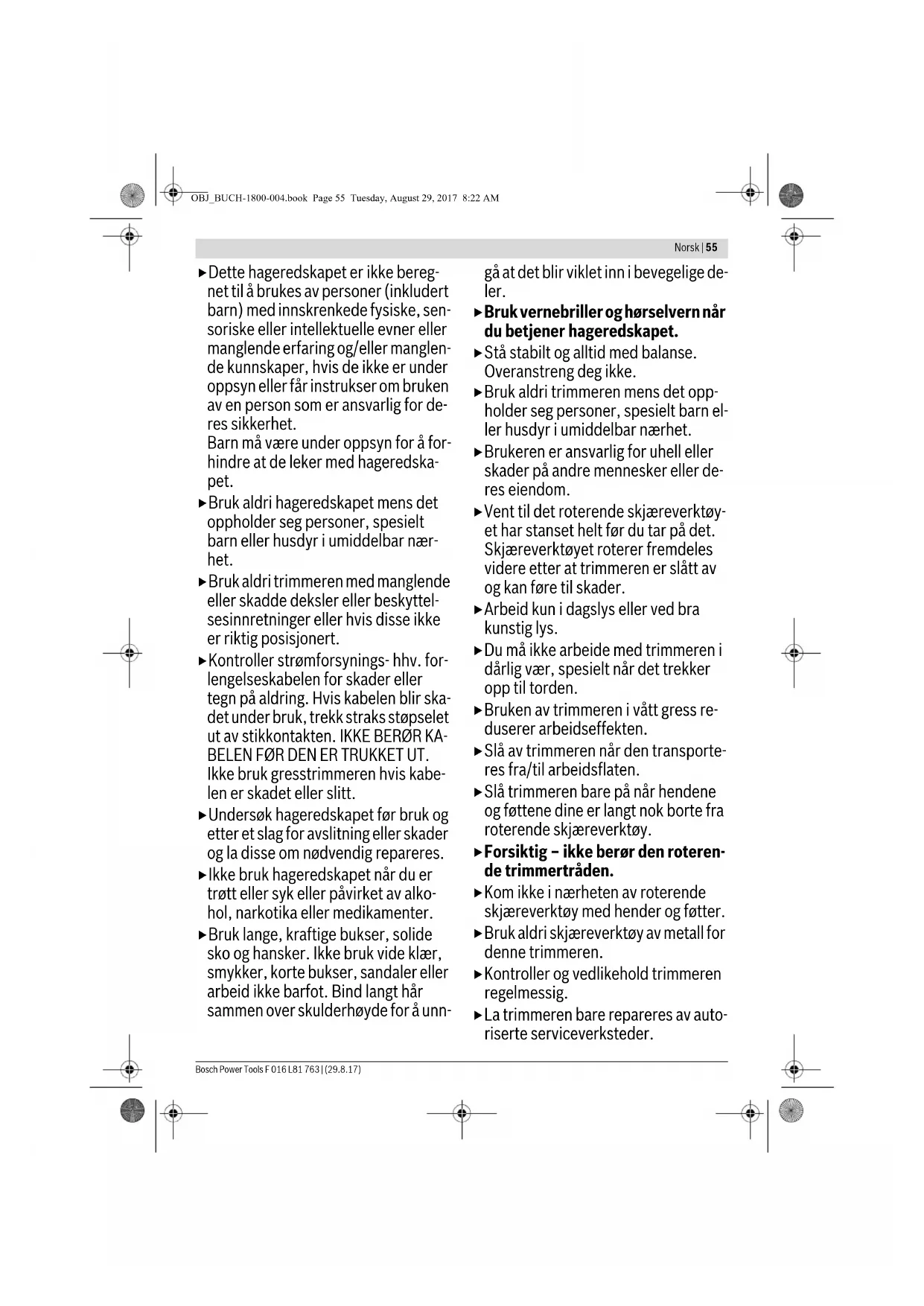 – Maksimal lengde 30 m for skjøteka- bler eller 60 m for kabeltromler med FI-feilstrøm-vernebryter Merk: Hvis det brukes en skjøteledning må denne ha en jordingstråd – som be- skrevet i sikkerhetsforskriftene – som via støpselet er forbundet med jor- dingstråden i det elektriske anlegget. OBJ_BUCH-1800-004.book Page 56 Tuesday, August 29, 2017 8:22 AMNorsk | 57 Bosch Power Tools F 016 L81 763 | (29.8.17) I tvilstilfeller må du spørre en utdannet elektriker eller nærmeste Bosch servi- ceverksted. OBS! Ikke forskriftsmessige skjøteledninger kan være far- lige. Skjøteledninger, støps- ler og koblinger må være vanntette modeller som er godkjent for uten- dørs bruk. Informasjon for produkter som ikke selges i GB: OBS! For din egen sikkerhet er det nød- vendig at støpselet på hageredskapet forbindes med skjøteledningen. Kop- lingen til skjøteledningen må være be- skyttet mot vannsprut, bestå av gummi eller ha gummitrekk. Skjøteledningen må brukes med strekkavlastning. Symboler Nedenstående symboler er viktige for lesing og forståelse av driftsinstruksen. Legg merke til symbolene og deres betyd- ning. En riktig tolkning av symbolene hjelper deg med å bruke hageredskapet på en bedre og sikrere måte. Formålsmessig bruk Maskinen er beregnet til klipping av gress og ugress under busker og i skråninger og i kanter, der man ikke kommer godt til med en gressklipper. Den er beregnet til bruk i en omgivelsestemperatur på mellom 0°C og 40°C. Tekniske data Støy-/vibrasjonsinformasjon Støyutslippsverdier målt i henhold til EN 50636-2-91. Maskinens A-bedømte typiske støynivå er: Lydtrykknivå 87 dB(A); lydeffektnivå 94 dB(A). Usikkerhet K =1,0 dB. Bruk hørselvern! Totale svingningsverdier a
