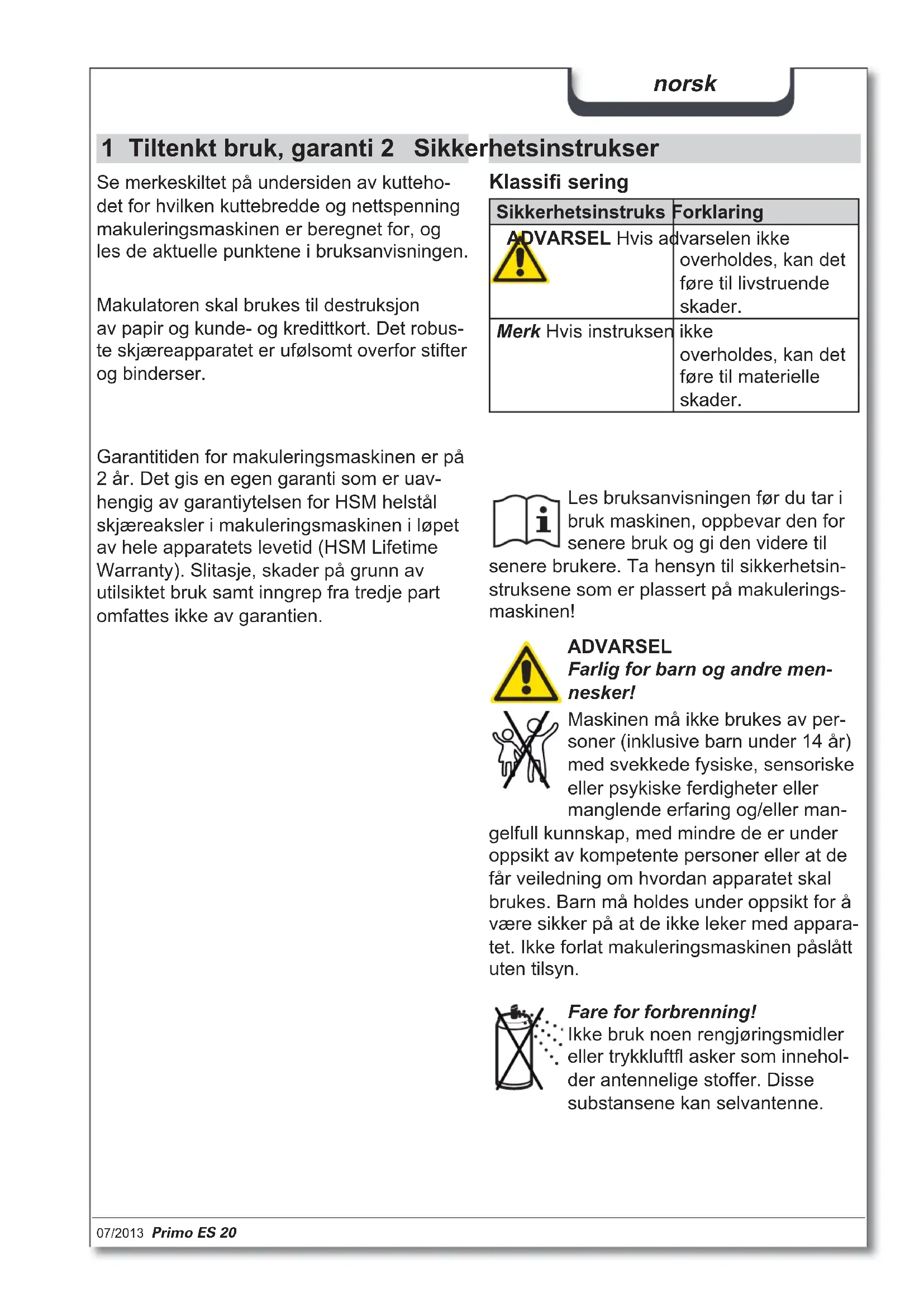 - EN 60950-1:2006 +A12:2011 Frickingen, 10.7.2013 ppa. Hubert Kötzinger - Ympäristötekniikan tuotekehityksen johtaja07/2013 Primo ES 20 63 norsk 1 Tiltenkt bruk, garanti 2 Sikkerhetsinstrukser Klassifi sering Sikkerhetsinstruks Forklaring ADVARSEL Hvis advarselen ikke overholdes, kan det føre til livstruende skader. Merk Hvis instruksen ikke overholdes, kan det føre til materielle skader. Les bruksanvisningen før du tar i bruk maskinen, oppbevar den for senere bruk og gi den videre til senere brukere. Ta hensyn til sikkerhetsin- struksene som er plassert på makulerings- maskinen! ADVARSEL Farlig for barn og andre men- nesker! Maskinen må ikke brukes av per- soner (inklusive barn under 14 år) med svekkede fysiske, sensoriske eller psykiske ferdigheter eller manglende erfaring og/eller man- gelfull kunnskap, med mindre de er under oppsikt av kompetente personer eller at de får veiledning om hvordan apparatet skal brukes. Barn må holdes under oppsikt for å være sikker på at de ikke leker med appara- tet. Ikke forlat makuleringsmaskinen påslått uten tilsyn. Garantitiden for makuleringsmaskinen er på 2 år. Det gis en egen garanti som er uav- hengig av garantiytelsen for HSM helstål skjæreaksler i makuleringsmaskinen i løpet av hele apparatets levetid (HSM Lifetime Warranty). Slitasje, skader på grunn av utilsiktet bruk samt inngrep fra tredje part omfattes ikke av garantien. Se merkeskiltet på undersiden av kutteho- det for hvilken kuttebredde og nettspenning makuleringsmaskinen er beregnet for, og les de aktuelle punktene i bruksanvisningen. Fare for forbrenning! Ikke bruk noen rengjøringsmidler eller trykkluftfl asker som innehol- der antennelige stoffer. Disse substansene kan selvantenne. Makulatoren skal brukes til destruksjon av papir og kunde- og kredittkort. Det robus- te skjæreapparatet er ufølsomt overfor stifter og binderser.64 Primo ES 20 07/2013 norsk ADVARSEL Farlig nettspenning! Feil håndtering av maskinen kan føre til elektrisk støt. – Kontroller at spenning og frekvens på ditt strømnett stemmer overens med spesifi - kasjonene på merkeskiltet før du setter i nettstøpselet. – Forsikre deg om at nettstøpselet er lett tilgjengelig. – Pass på at det ikke kommer vann i maku- leringsmaskinen. Verken nettkabel eller nettstøpsel må dyppes i vann. – Ta aldri i nettstøpslet med våte hender. – Trekk aldri nettstøpslet ut av stikkontak- ten etter ledningen, ta alltid tak i selve nettstøpslet. – Bruk apparatet kun innendørs og på et tørt sted. Det må aldri brukes i våtrom el- ler i regnvær. ADVARSEL Fare for personskader! Grip aldri inn i sprekken på papi- rinnmatingsåpningen. Fare for personskader på grunn av oppfanging! Ikke beveg langt hår, løst antrekk, slips, sjal, hals- og armbånd etc. inn i området rundt papirinnma- tingsåpningen. Ikke makuler noe materiale som har lett for å danne løkker, som f.eks. bånd, snorer, plastfolie. Kontroller regelmessig om appa- ratet og kabelen er skadet. Slå av makuleringsmaskinen og trekk ut kontakten ved skader eller feil- funksjon samt før fl ytting eller rengjøring. – Hold apparatet, nettstøpslet og nettkabe- len unna åpen fl amme og varme fl ater. Ventilasjonsåpningene må være fri og befi nne seg min. 5 cm. fra vegg eller mø- bler. – Apparatet er ikke beregnet for bruk i nær- heten av skjerm- hhv. kontorarbeidsplas- ser. Servicearbeider som innebærer at man må fjerne kapslingsdekslene, må kun utføres av HMS-kunde- service og service-teknikere fra våre avtalepartnere. Adresser til kundeservice se side 68. HMS garanterer levering av reservedeler i 10 år etter at produksjonen av denne mo- dellen opphører. Merk Fare på grunn av feil bruk Bruk maskinen kun slik det er beskrevet i kapitlet ”Tiltenkt bruk”.07/2013 Primo ES 20 65 norsk 3 Oversikt 1 Beholder for makuleringsmasse 2 Skjærehode 3 Sikkerhetsinstrukser, sikkerhetselement 4 Innmatingsspalte for papir og kunde- og kredittkort 5 Start-stopp-automatikk 6 Reverseringsknapp R: revers 7 Merkeskilt på undersiden av kuttehodet 4 Leveringsomfang