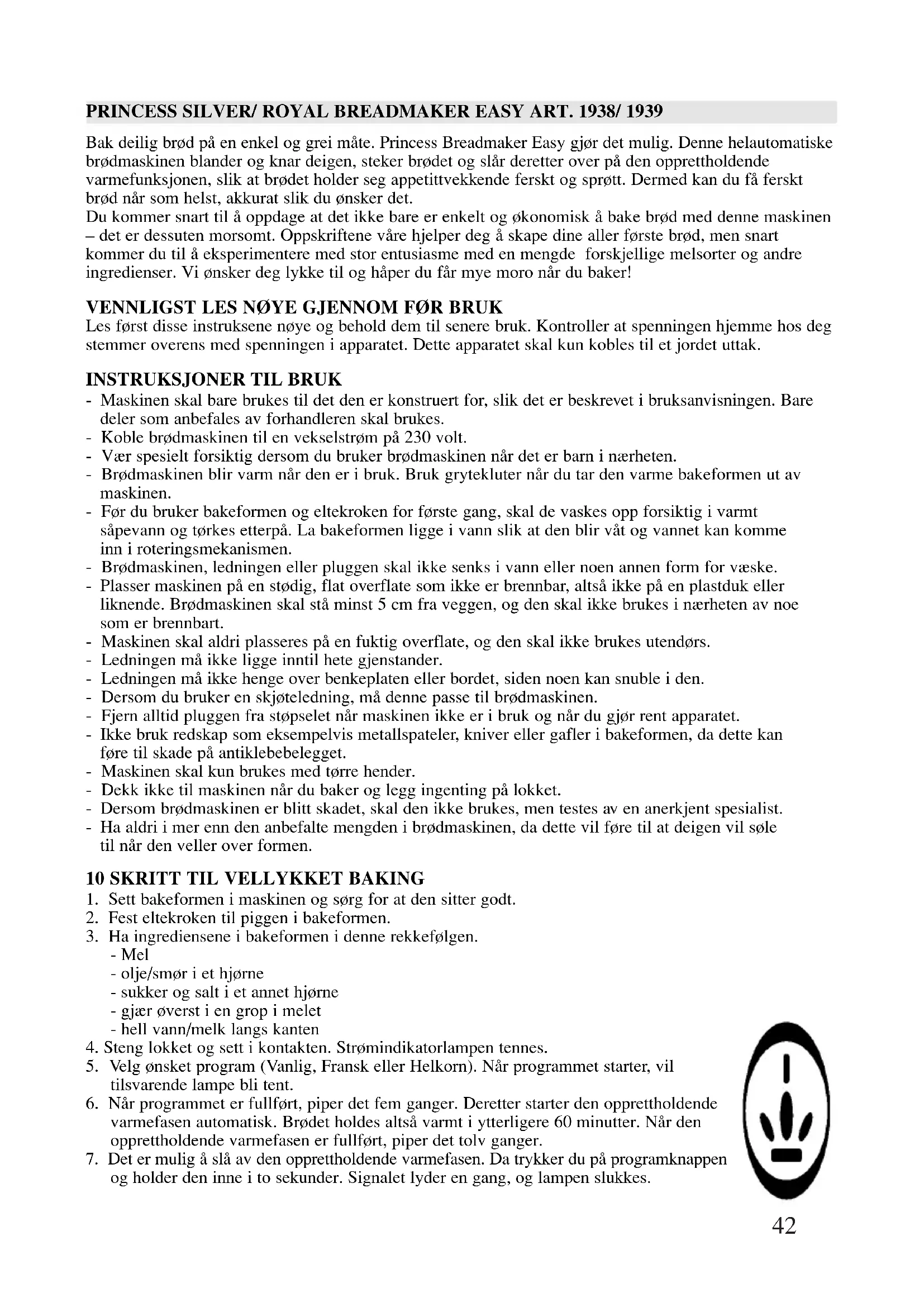 Bak deilig brød på en enkel og grei måte. Princess Breadmaker Easy gjør det mulig. Denne helautomatiske brødmaskinen blander og knar deigen, steker brødet og slår deretter over på den opprettholdende varmefunksjonen, slik at brødet holder seg appetittvekkende ferskt og sprøtt. Dermed kan du få ferskt brød når som helst, akkurat slik du ønsker det. Du kommer snart til å oppdage at det ikke bare er enkelt og økonomisk å bake brød med denne maskinen – det er dessuten morsomt. Oppskriftene våre hjelper deg å skape dine aller første brød, men snart kommer du til å eksperimentere med stor entusiasme med en mengde forskjellige melsorter og andre ingredienser. Vi ønsker deg lykke til og håper du får mye moro når du baker! VENNLIGST LES NØYE GJENNOM FØR BRUK Les først disse instruksene nøye og behold dem til senere bruk. Kontroller at spenningen hjemme hos deg stemmer overens med spenningen i apparatet. Dette apparatet skal kun kobles til et jordet uttak.