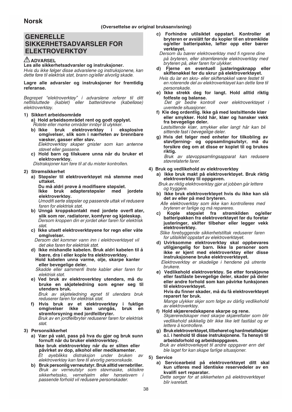a) Servicearbeid på elektroverktøyet ditt skal kun utføres med identiske reservedeler av en kvalifi sert reparatør. Dette sørger for at sikkerheten på elektroverktøyet blir ivaretatt. GENERELLE SIKKERHETSADVARSLER FOR ELEKTROVERKTØY ADVARSEL Les alle sikkerhetsadvarsler og instruksjoner. Hvis du ikke følger disse advarslene og instruksjonene, kan dette føre til elektrisk støt, brann og/eller alvorlig skade. Lagre alle advarsler og instruksjoner for fremtidig referanse. Begrepet “elektroverktøy” i advarslene referer til ditt nettilsluttede (kablet) eller batteridrevne (kabelløse) elektroverktøy.