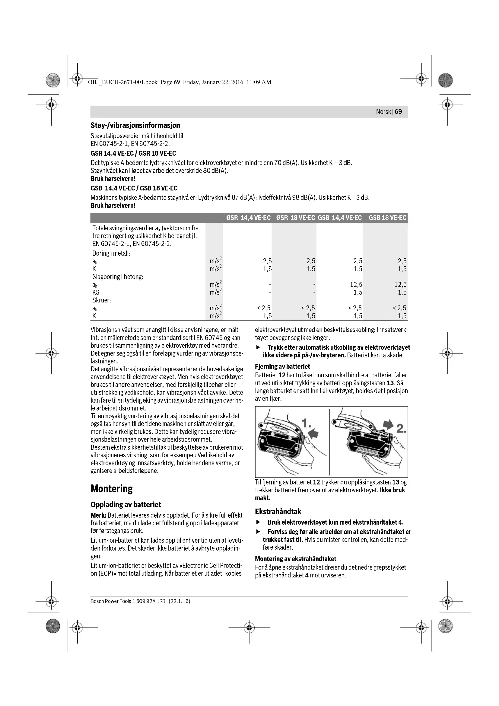 Maskinens typiske A-bedømte støynivå er: Lydtrykknivå 87 dB(A); lydeffektnivå 98 dB(A). Usikkerhet K =3 dB. Bruk hørselvern! Vibrasjonsnivået som er angitt i disse anvisningene, er målt iht. en målemetode som er standardisert i EN 60745 og kan brukes til sammenligning av elektroverktøy med hverandre. Det egner seg også til en foreløpig vurdering av vibrasjonsbe- lastningen. Det angitte vibrasjonsnivået representerer de hovedsakelige anvendelsene til elektroverktøyet. Men hvis elektroverktøyet brukes til andre anvendelser, med forskjellig tilbehør eller utilstrekkelig vedlikehold, kan vibrasjonsnivået avvike. Dette kan føre til en tydelig øking av vibrasjonsbelastningen over he- le arbeidstidsrommet. Til en nøyaktig vurdering av vibrasjonsbelastningen skal det også tas hensyn til de tidene maskinen er slått av eller går, men ikke virkelig brukes. Dette kan tydelig redusere vibra- sjonsbelastningen over hele arbeidstidsrommet. Bestem ekstra sikkerhetstiltak til beskyttelse av brukeren mot vibrasjonenes virkning, som for eksempel: Vedlikehold av elektroverktøy og innsatsverktøy, holde hendene varme, or- ganisere arbeidsforløpene. Montering Opplading av batteriet Merk: Batteriet leveres delvis oppladet. For å sikre full effekt fra batteriet, må du lade det fullstendig opp i ladeapparatet før førstegangs bruk. Litium-ion-batteriet kan lades opp til enhver tid uten at leveti- den forkortes. Det skader ikke batteriet å avbryte oppladin- gen. Litium-ion-batteriet er beskyttet av «Electronic Cell Protecti- on (ECP)» mot total utlading. Når batteriet er utladet, kobles elektroverktøyet ut med en beskyttelseskobling: Innsatsverk- tøyet beveger seg ikke lenger. Trykk etter automatisk utkobling av elektroverktøyet ikke videre på på-/av-bryteren. Batteriet kan ta skade. Fjerning av batteriet Batteriet 12 har to låsetrinn som skal hindre at batteriet faller ut ved utilsiktet trykking av batteri-opplåsingstasten 13. Så lenge batteriet er satt inn i el-verktøyet, holdes det i posisjon av en fjær. Til fjerning av batteriet 12 trykker du opplåsingstasten 13 og trekker batteriet fremover ut av elektroverktøyet. Ikke bruk makt. Ekstrahåndtak Bruk elektroverktøyet kun med ekstrahåndtaket 4. Forviss deg før alle arbeider om at ekstrahåndtaket er trukket fast til. Hvis du mister kontrollen, kan dette med- føre skader. Montering av ekstrahåndtaket For å åpne ekstrahåndtaket dreier du det nedre grepsstykket på ekstrahåndtaket 4 mot urviseren. GSR 14,4 VE-EC GSR 18 VE-EC GSB 14,4 VE-EC GSB 18 VE-EC Totale svingningsverdier a