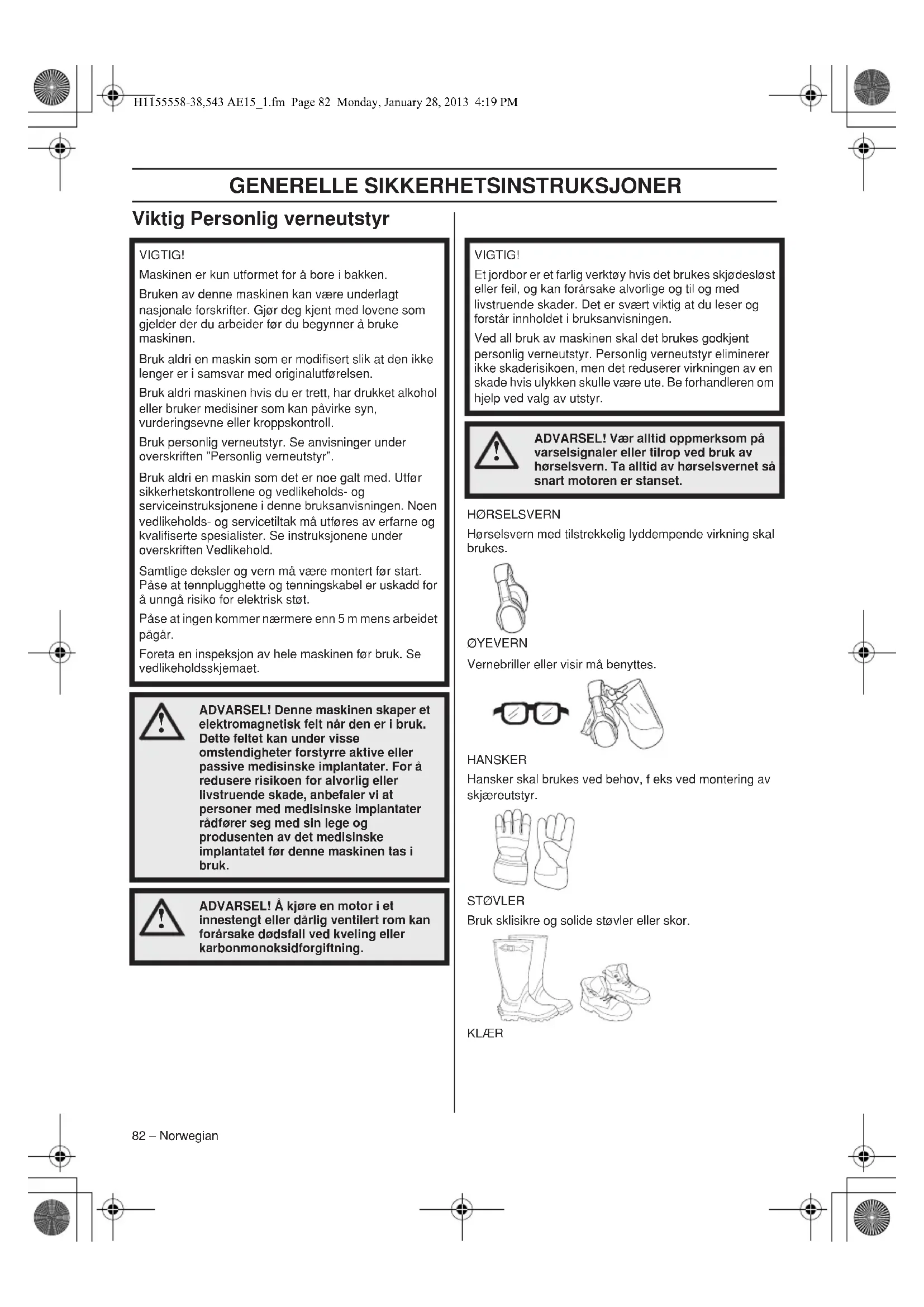 1 Påfylling av olje 2 Luftfilterdeksel 3 Chokeregulator 4 Gassregulator 5 Gir 6 Bor (Fåes som tilbehør.) 7 Skjæregger (Fåes som tilbehør.) 8 Skjæreutstyr 9 Startgassknapp 10 Stoppbryter 11 Starthåndtak 12 Brennstoffpumpe 13 Brennstofftank 14 Tennplugghette og tennplugg 15 Sylinderdeksel 16 Bruksanvisning 17 Kombinøkkel H1155558-38,543 AE15_1.fm Page 81 Monday, January 28, 2013 4:19 PMGENERELLE SIKKERHETSINSTRUKSJONER 82 – Norwegian Viktig Personlig verneutstyr HØRSELSVERN Hørselsvern med tilstrekkelig lyddempende virkning skal brukes. ØYEVERN Vernebriller eller visir må benyttes. HANSKER Hansker skal brukes ved behov, f eks ved montering av skjæreutstyr. STØVLER Bruk sklisikre og solide støvler eller skor. KLÆR VIGTIG! Maskinen er kun utformet for å bore i bakken. Bruken av denne maskinen kan være underlagt nasjonale forskrifter. Gjør deg kjent med lovene som gjelder der du arbeider før du begynner å bruke maskinen. Bruk aldri en maskin som er modifisert slik at den ikke lenger er i samsvar med originalutførelsen. Bruk aldri maskinen hvis du er trett, har drukket alkohol eller bruker medisiner som kan påvirke syn, vurderingsevne eller kroppskontroll. Bruk personlig verneutstyr. Se anvisninger under overskriften ”Personlig verneutstyr”. Bruk aldri en maskin som det er noe galt med. Utfør sikkerhetskontrollene og vedlikeholds- og serviceinstruksjonene i denne bruksanvisningen. Noen vedlikeholds- og servicetiltak må utføres av erfarne og kvalifiserte spesialister. Se instruksjonene under overskriften Vedlikehold. Samtlige deksler og vern må være montert før start. Påse at tennplugghette og tenningskabel er uskadd for å unngå risiko for elektrisk støt. Påse at ingen kommer nærmere enn 5 m mens arbeidet pågår. Foreta en inspeksjon av hele maskinen før bruk. Se vedlikeholdsskjemaet.