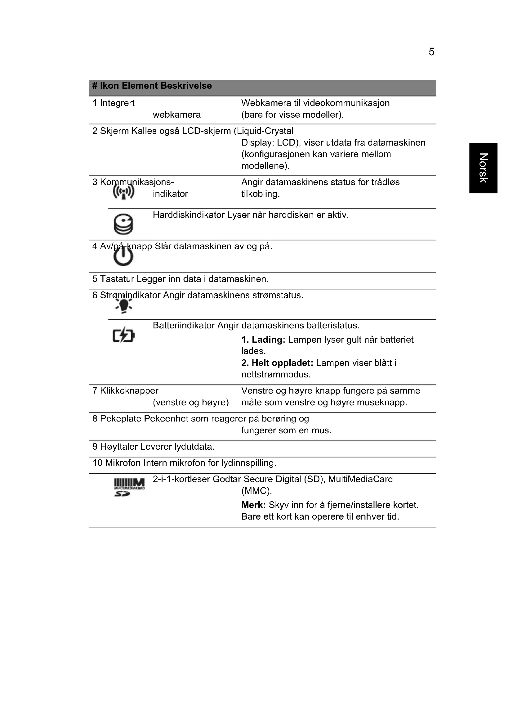 nettstrømmodus. 7 Klikkeknapper (venstre og høyre) Venstre og høyre knapp fungere på samme måte som venstre og høyre museknapp. 8 Pekeplate Pekeenhet som reagerer på berøring og fungerer som en mus. 9 Høyttaler Leverer lydutdata. 10 Mikrofon Intern mikrofon for lydinnspilling. 2-i-1-kortleser Godtar Secure Digital (SD), MultiMediaCard (MMC). Merk: Skyv inn for å fjerne/installere kortet. Bare ett kort kan operere til enhver tid.6 Norsk Hurtigtaster Datamaskinen bruker hurtigtaster eller tastekombinasjoner for å få tilgang til datamaskinens kontroller, for eksempel skjermens lysstyrke og volumutgang. Når du skal aktivere hurtigtaster, trykker du på og holder <Fn>-tasten før du trykker på den neste tasten i hurtigtastkombinasjonen. Hurtigtast Ikon Funksjon Beskrivelse <Fn> + <F3> Kommunikasjon Aktiverer/deaktiverer datamaskinens kommunikasjonsenheter. (Kommunikasjonsenheter kan variere i konfigurasjon.) <Fn> + <F4> Dvale Setter datamaskinen i dvalemodus. <Fn> + <F5> Skjermbytte Bytter mellom visning på vanlig skjerm, ekstern skjerm (hvis tilkoblet) eller begge deler. <Fn> + <F6> Visning av Slå av skjermens bakgrunnsbelysning for å spare strøm. Trykk på en hvilken som helst tast for å gå tilbake. <Fn> + <F7> Pekeplate av/på Slår datamaskinen av og på. <Fn> + <F8> Høyttaler av/på Slår høyttalerne av og på. <Fn> + < > Volum opp Øker lydvolumet. <Fn> + < > Volum ned Reduserer lydvolumet. <Fn> + < > Lysstyrke opp Øker skjermens lysstyrke. <Fn> + < > Lysstyrke ned Reduserer skjermens lysstyrke. <Fn> + <Home> Spill av/pause Spill av eller pause en valgt mediefil. <Fn> + <Pg Up> Stopp Stopp avspilling av den valgte mediefilen. <Fn> + <Pg Dn> Forrige Returner til forrige mediefil. <Fn> + <End> Neste Hopp til neste mediefil.7 Norsk Bakre visning Venstre visning # Element Beskrivelse 1 Batteriindikator Sørger for strøm til datamaskinen når den er frakoblet. # Ikon Element Beskrivelse 1 Strømtilkobling Kobler til en batterieliminator. 2 Port for ekstern skjerm (VGA) Kobler til en skjermenhet (f.eks. ekstern skjerm, LCD-projektor). 3 Ethernet-port (RJ-45) Kobler til et Ethernet 10/100/1000-basert nettverk. 4 HDMI-port Støtter høydefinisjons digitale videoforbindelser. 5 USB 2.0-port Kobler til USB 2.0-enheter (f.eks. USB-mus, USB-kamera). 6 Mikrofonplugg Mottar inndata fra eksterne mikrofoner. Hodetelefon/høyttalere/ line-out-port Kobles til utdataenheter for lyd (f.eks. høyttalere, hodetelefoner).