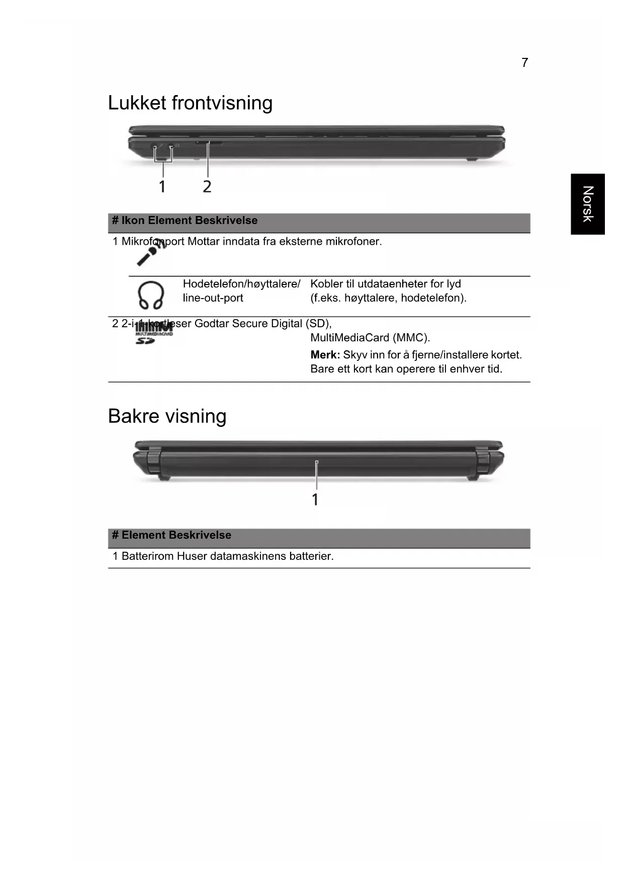 nettstrømmodus. Harddiskindikator Lyser når harddisken er aktiv. Kommunikasjons- indikator Angir datamaskinens status for trådløs tilkobling. 9 Håndleddshviler Komfortabelt støtteområde for hendene når du bruker datamaskinen. 10 Høyttaler Leverer lydutdata.6 Norsk Hurtigtaster Datamaskinen bruker hurtigtaster eller tastekombinasjoner for tilgang til de fleste av maskinens funksjoner, f.eks. skjermens lysstyrke og lydvolumet. Når du skal aktivere hurtigtaster, trykker du på og holder <Fn>-tasten før du trykker på den neste tasten i hurtigtastkombinasjonen. Hurtigtast Ikon Funksjon Beskrivelse <Fn> + <F3> Kommunikasjon Aktiverer/deaktiverer datamaskinens kommunikasjonsenheter. (Kommunikasjonsenheter kan variere i konfigurasjon.) <Fn> + <F4> Dvale Setter datamaskinen i dvalemodus. <Fn> + <F5> Skjermbytte Bytter mellom visning på vanlig skjerm, ekstern skjerm (hvis tilkoblet) eller begge deler. <Fn> + <F6> Visning av Slå av skjermens bakgrunnsbelysning for å spare strøm. Trykk på en hvilken som helst tast for å gå tilbake. <Fn> + <F7> Pekeplate av/på Slår den interne berøringsplaten av og på. <Fn> + <F8> Høyttaler av/på Slår høyttalerne av og på. <Fn> + < > Lysstyrke opp Øker skjermens lysstyrke. <Fn> + < > Lysstyrke ned Reduserer skjermens lysstyrke. <Fn> + < > Volum opp Øker lydvolumet. <Fn> + < > Volum ned Reduserer lydvolumet. <Fn> + <Home> Play/Pause Spill av eller pause en valgt mediefil. <Fn> + <Pg Up> Stopp Stopp avspilling av den valgte mediefilen. <Fn> + <Pg Dn> Forrige Returner til forrige mediefil. <Fn> + <End> Neste Hopp til neste mediefil.7 Norsk Lukket frontvisning Bakre visning # Ikon Element Beskrivelse1 Mikrofonport Mottar inndata fra eksterne mikrofoner.Hodetelefon/høyttalere/line-out-portKobler til utdataenheter for lyd (f.eks. høyttalere, hodetelefon).2 2-i-1-kortleser Godtar Secure Digital (SD), MultiMediaCard (MMC).Merk: Skyv inn for å fjerne/installere kortet. Bare ett kort kan operere til enhver tid.# Element Beskrivelse1 Batterirom Huser datamaskinens batterier.