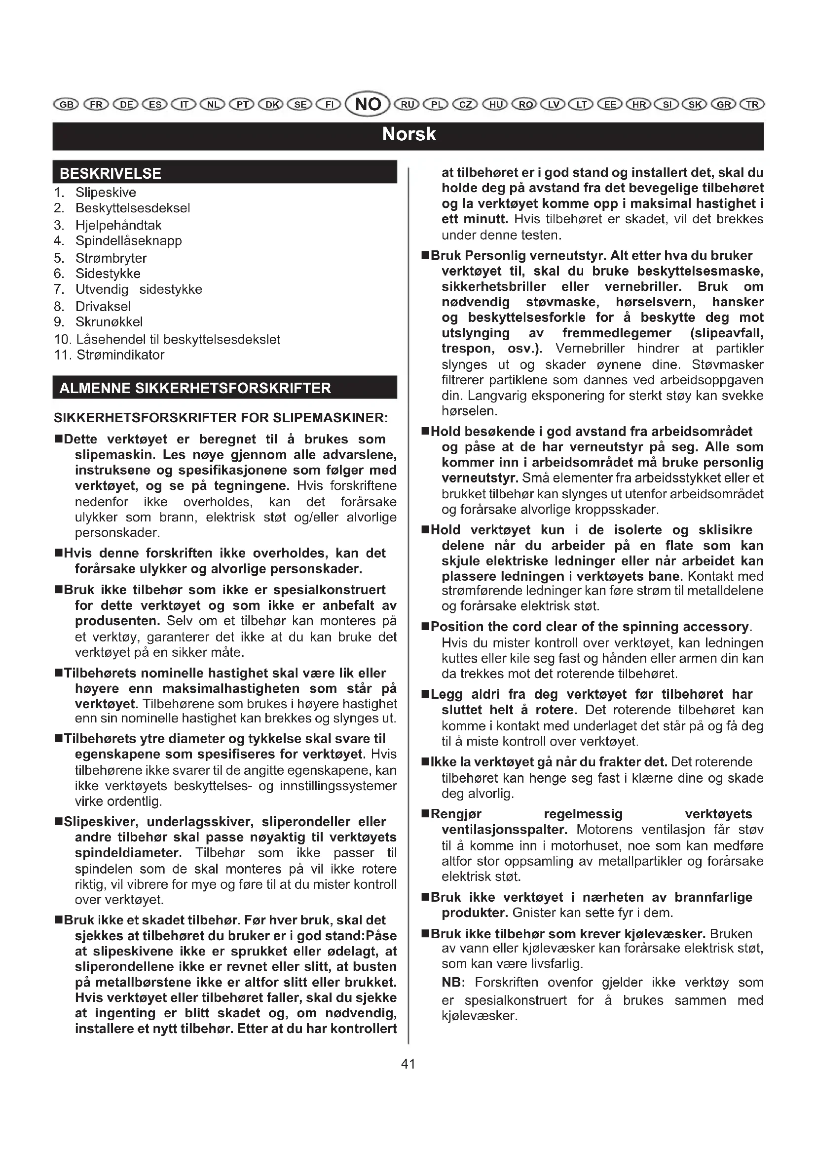 ALMENNE SIKKERHETSFORSKRIFTER SIKKERHETSFORSKRIFTER FOR SLIPEMASKINER: Dette verktøyet er beregnet til å brukes som slipemaskin. Les nøye gjennom alle advarslene, instruksene og spesifikasjonene som følger med verktøyet, og se på tegningene. Hvis forskriftene nedenfor ikke overholdes, kan det forårsake ulykker som brann, elektrisk støt og/eller alvorlige personskader. Hvis denne forskriften ikke overholdes, kan det forårsake ulykker og alvorlige personskader. Bruk ikke tilbehør som ikke er spesialkonstruert for dette verktøyet og som ikke er anbefalt av produsenten. Selv om et tilbehør kan monteres på et verktøy, garanterer det ikke at du kan bruke det verktøyet på en sikker måte. Tilbehørets nominelle hastighet skal være lik eller høyere enn maksimalhastigheten som står på verktøyet. Tilbehørene som brukes i høyere hastighet enn sin nominelle hastighet kan brekkes og slynges ut. Tilbehørets ytre diameter og tykkelse skal svare til egenskapene som spesifiseres for verktøyet. Hvis tilbehørene ikke svarer til de angitte egenskapene, kan ikke verktøyets beskyttelses- og innstillingssystemer virke ordentlig. Slipeskiver, underlagsskiver, sliperondeller eller andre tilbehør skal passe nøyaktig til verktøyets spindeldiameter. Tilbehør som ikke passer til spindelen som de skal monteres på vil ikke rotere riktig, vil vibrere for mye og føre til at du mister kontroll over verktøyet. Bruk ikke et skadet tilbehør. Før hver bruk, skal det sjekkes at tilbehøret du bruker er i god stand:Påse at slipeskivene ikke er sprukket eller ødelagt, at sliperondellene ikke er revnet eller slitt, at busten på metallbørstene ikke er altfor slitt eller brukket. Hvis verktøyet eller tilbehøret faller, skal du sjekke at ingenting er blitt skadet og, om nødvendig, installere et nytt tilbehør. Etter at du har kontrollert at tilbehøret er i god stand og installert det, skal du holde deg på avstand fra det bevegelige tilbehøret og la verktøyet komme opp i maksimal hastighet i ett minutt. Hvis tilbehøret er skadet, vil det brekkes under denne testen. Bruk Personlig verneutstyr. Alt etter hva du bruker verktøyet til, skal du bruke beskyttelsesmaske, sikkerhetsbriller eller vernebriller. Bruk om nødvendig støvmaske, hørselsvern, hansker og beskyttelsesforkle for å beskytte deg mot utslynging av fremmedlegemer (slipeavfall, trespon, osv.). Vernebriller hindrer at partikler slynges ut og skader øynene dine. Støvmasker filtrerer partiklene som dannes ved arbeidsoppgaven din. Langvarig eksponering for sterkt støy kan svekke hørselen. Hold besøkende i god avstand fra arbeidsområdet og påse at de har verneutstyr på seg. Alle som kommer inn i arbeidsområdet må bruke personlig verneutstyr. Små elementer fra arbeidsstykket eller et brukket tilbehør kan slynges ut utenfor arbeidsområdet og forårsake alvorlige kroppsskader. Hold verktøyet kun i de isolerte og sklisikre delene når du arbeider på en flate som kan skjule elektriske ledninger eller når arbeidet kan plassere ledningen i verktøyets bane. Kontakt med strømførende ledninger kan føre strøm til metalldelene og forårsake elektrisk støt. Position the cord clear of the spinning accessory. Hvis du mister kontroll over verktøyet, kan ledningen kuttes eller kile seg fast og hånden eller armen din kan da trekkes mot det roterende tilbehøret. Legg aldri fra deg verktøyet før tilbehøret har sluttet helt å rotere. Det roterende tilbehøret kan komme i kontakt med underlaget det står på og få deg til å miste kontroll over verktøyet. Ikke la verktøyet gå når du frakter det. Det roterende tilbehøret kan henge seg fast i klærne dine og skade deg alvorlig. Rengjør regelmessig verktøyets ventilasjonsspalter. Motorens ventilasjon får støv til å komme inn i motorhuset, noe som kan medføre altfor stor oppsamling av metallpartikler og forårsake elektrisk støt. Bruk ikke verktøyet i nærheten av brannfarlige produkter. Gnister kan sette fyr i dem. Bruk ikke tilbehør som krever kjølevæsker. Bruken av vann eller kjølevæsker kan forårsake elektrisk støt, som kan være livsfarlig. NB: Forskriften ovenfor gjelder ikke verktøy som er spesialkonstruert for å brukes sammen med kjølevæsker.42 Norsk