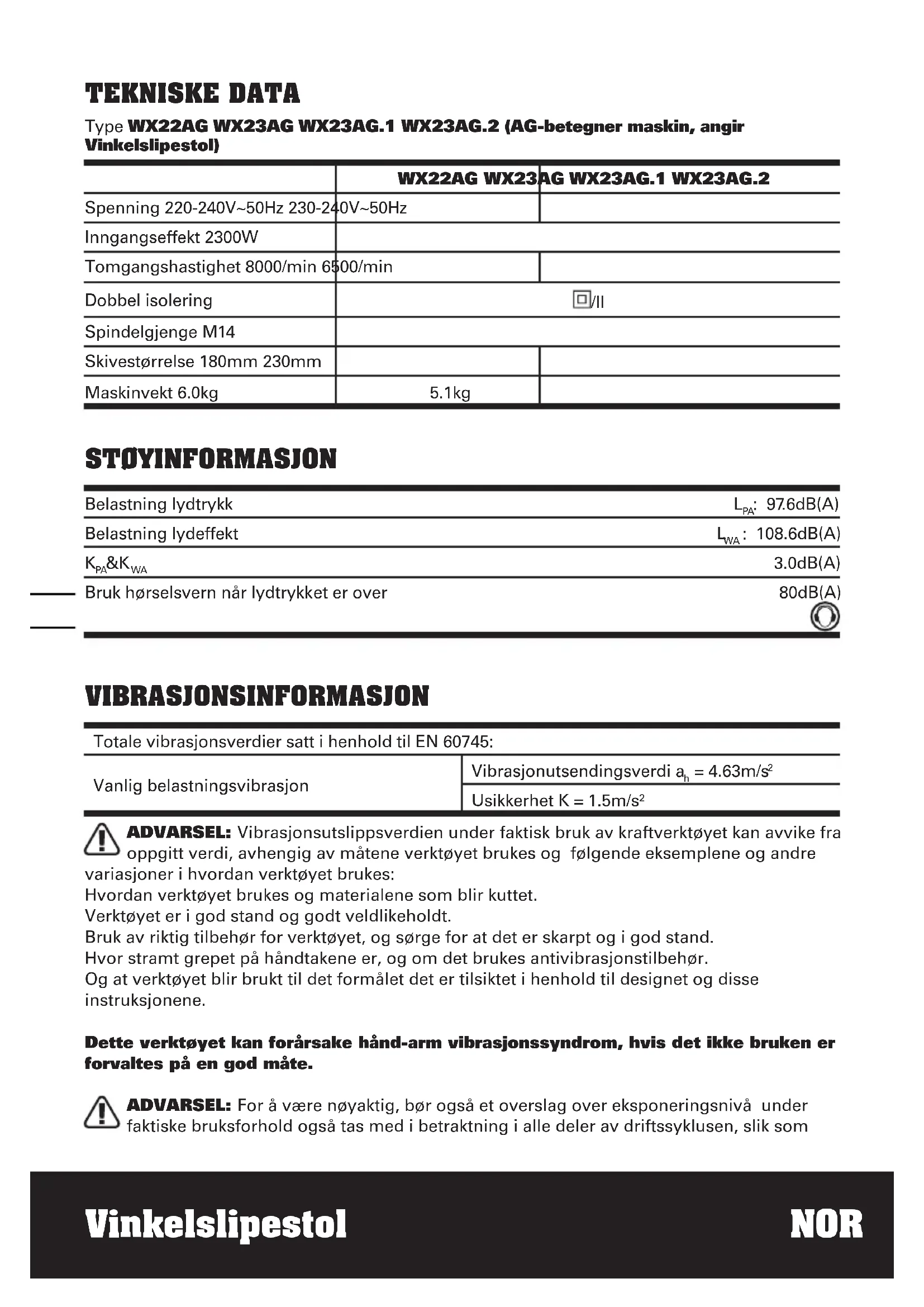 C eller lavere. Planlegg arbeidstimeplanen din slik at du sprer bruk av høyvibrasjonsverktøy utover flere dager. TILBEHØR Skiftenøkkel 1 Antivibrasjon hjelpehåndtak 1 Metallslipeskive (WX22AG WX23AG WX23AG.1) 1 Vi anbefaler at du kjøper alle dine rekvisiter fra samme butikken der du kjøpte verktøyet. Bruk gode kvalitetsrekvisitter merket med et velkjent bransjenavn. Velg kvalitet i forhold til det arbeidet du akter å gå i gang med. Vi viser til rekvisittpakningen for videre detaljer. Butikkpersonalet kan også hjelpe deg med hjelp og råd.Vinkelslipestol NOR