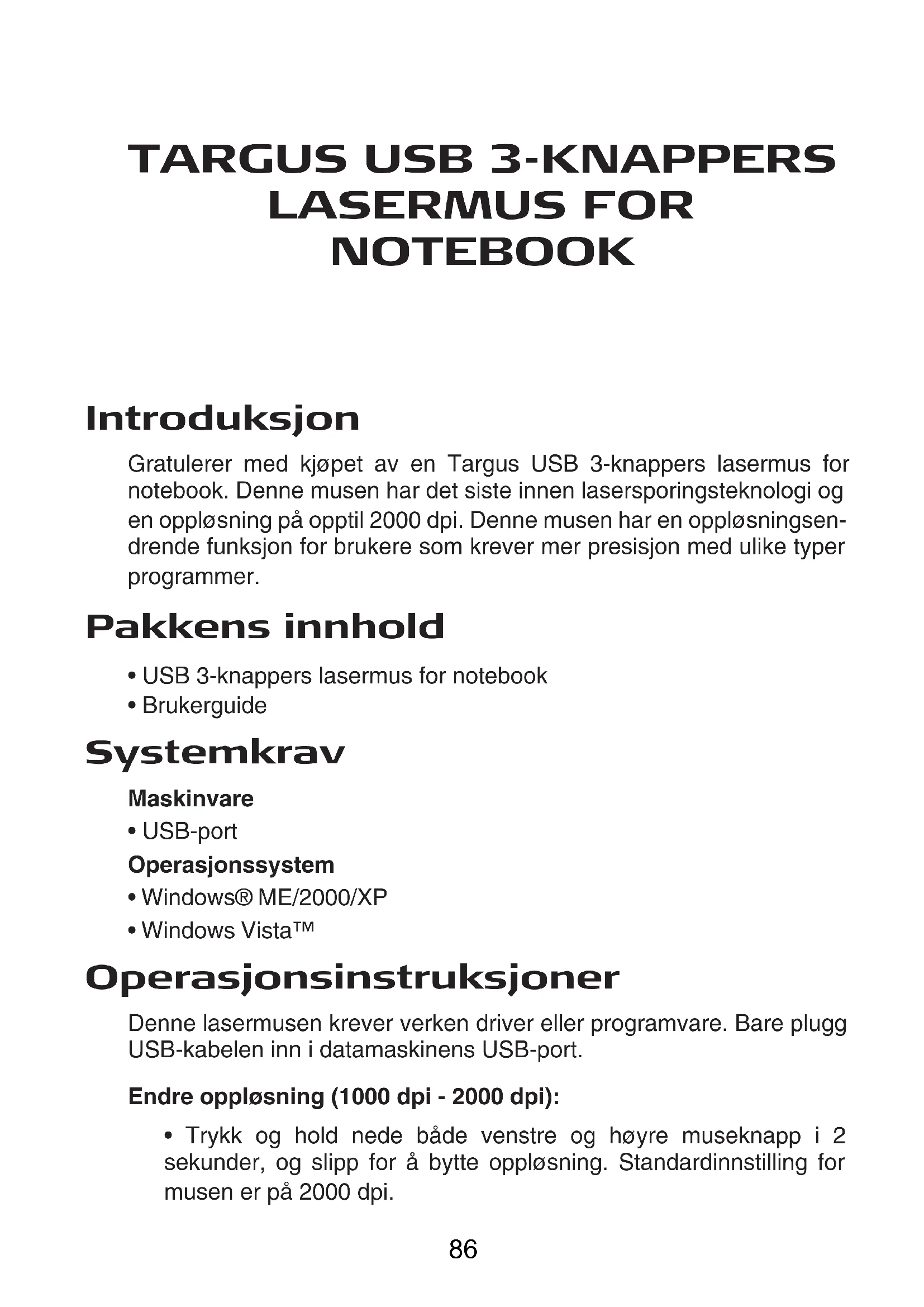 LASERMUS FOR NOTEBOOK Introduksjon Gratulerer med kjøpet av en Targus USB 3-knappers lasermus for notebook. Denne musen har det siste innen lasersporingsteknologi og en oppløsning på opptil 2000 dpi. Denne musen har en oppløsningsen- drende funksjon for brukere som krever mer presisjon med ulike typer programmer. Pakkens innhold