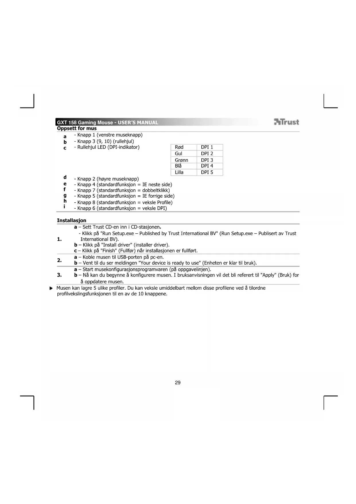 Rød DPI 1 Gul DPI 2 Grønn DPI 3 Blå DPI 4 Lilla DPI 5 - Knapp 2 (høyre museknapp) - Knapp 4 (standardfunksjon = IE neste side) - Knapp 7 (standardfunksjon = dobbeltklikk) - Knapp 5 (standardfunksjon = IE forrige side) - Knapp 8 (standardfunksjon = veksle Profile) - Knapp 6 (standardfunksjon = veksle DPI)
