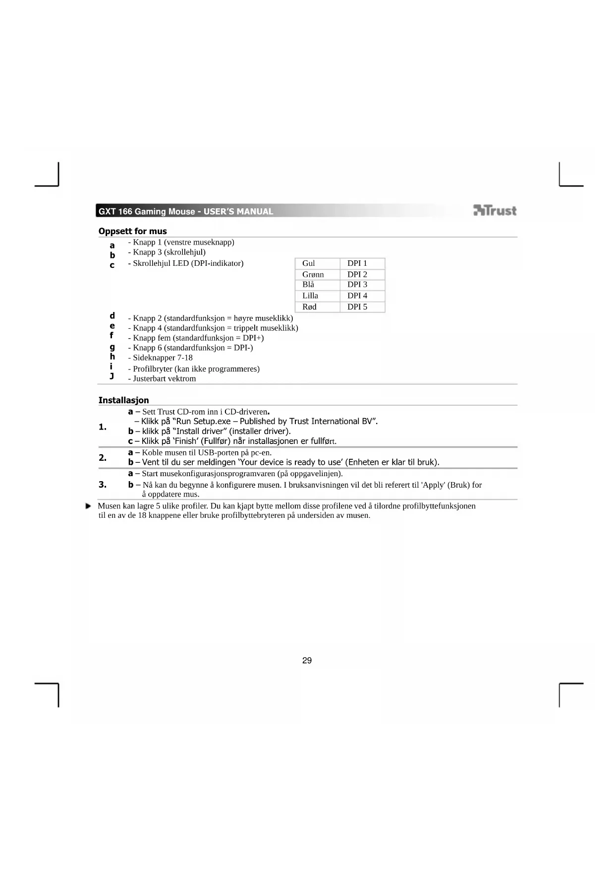 Gjenopprette standardinnstillinger - Klikk på ‘Reset All’ for å tilbakestille alle profiler. - Klikk på ‘Restore’ for å gjenopprette 1 profil (den profilen som er valgt). - Klikk på ‘OK’ for å tilbakestille alle innstillinger. - Klikk på ‘Apply’ Musen oppdateres. Du kan laste ned spillspesifikke profiler fra Trust nettside http://www.trust.com/19816.GXT 166 Gaming Mouse - USER’S MANUAL