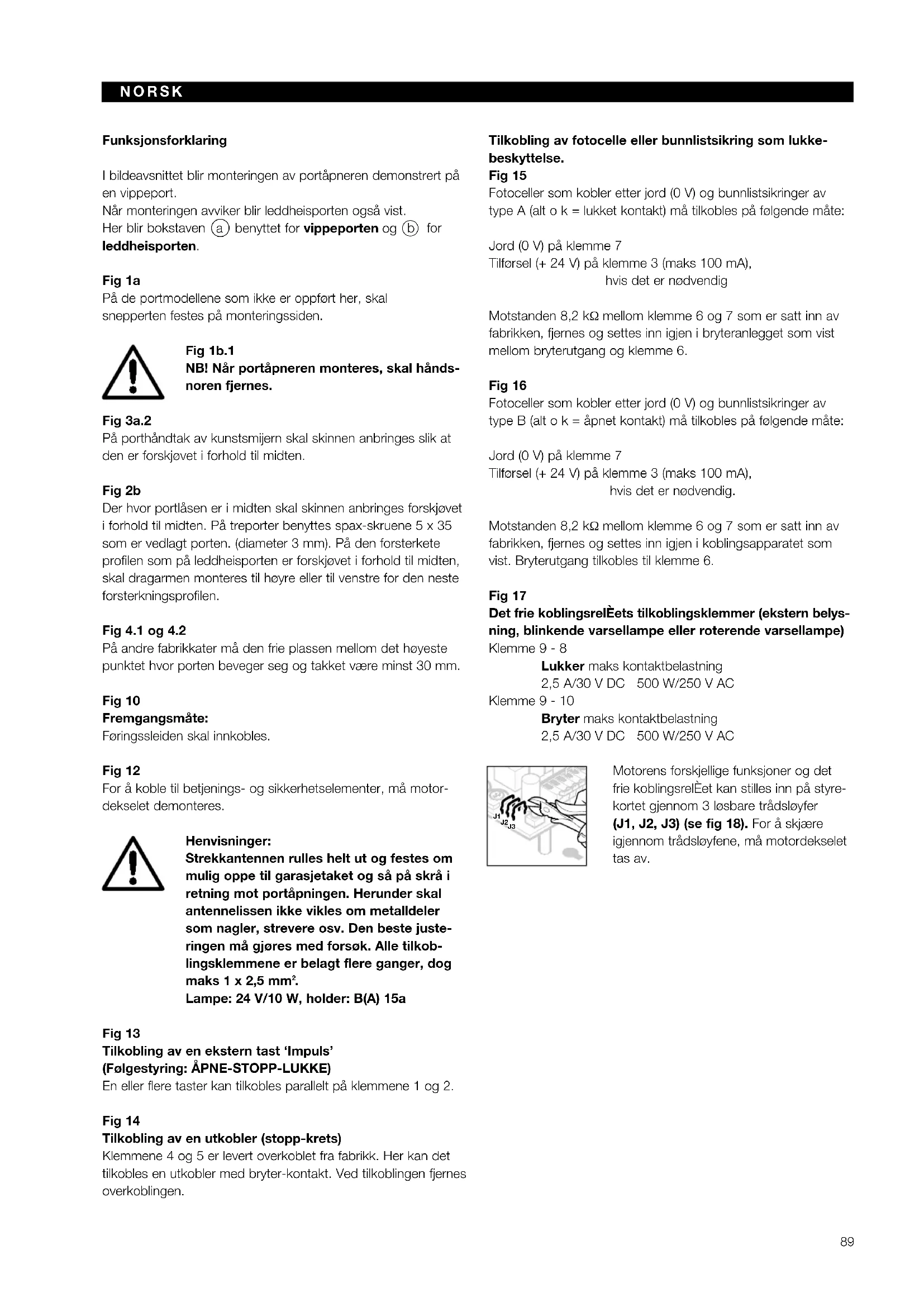 b for leddheisporten. Fig 1a På de portmodellene som ikke er oppført her, skal snepperten festes på monteringssiden. Fig 1b.1 NB! Når portåpneren monteres, skal hånds- noren fjernes. Fig 3a.2 På porthåndtak av kunstsmijern skal skinnen anbringes slik at den er forskjøvet i forhold til midten. Fig 2b Der hvor portlåsen er i midten skal skinnen anbringes forskjøvet i forhold til midten. På treporter benyttes spax-skruene 5 x 35 som er vedlagt porten. (diameter 3 mm). På den forsterkete profilen som på leddheisporten er forskjøvet i forhold til midten, skal dragarmen monteres til høyre eller til venstre for den neste forsterkningsprofilen. Fig 4.1 og 4.2 På andre fabrikkater må den frie plassen mellom det høyeste punktet hvor porten beveger seg og takket være minst 30 mm. Fig 10 Fremgangsmåte: Føringssleiden skal innkobles. Fig 12 For å koble til betjenings- og sikkerhetselementer, må motor- dekselet demonteres. Henvisninger: Strekkantennen rulles helt ut og festes om mulig oppe til garasjetaket og så på skrå i retning mot portåpningen. Herunder skal antennelissen ikke vikles om metalldeler som nagler, strevere osv. Den beste juste- ringen må gjøres med forsøk. Alle tilkob- lingsklemmene er belagt flere ganger, dog maks 1 x 2,5 mm