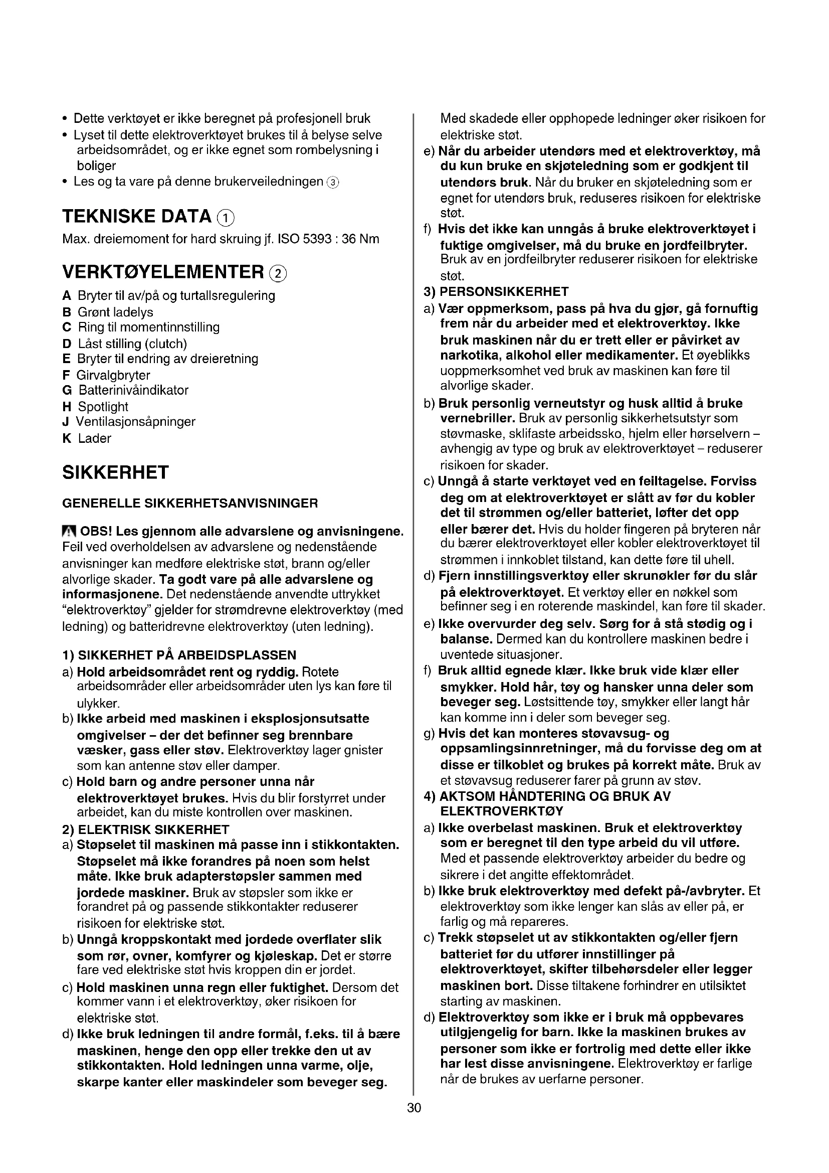 - Les og ta vare på denne brukerveiledningen 3 TEKNISKE DATA 1 Max. dreiemoment for hard skruing jf. ISO 5393 : 36 Nm VERKTØYELEMENTER 2 A Bryter til av/på og turtallsregulering B Grønt ladelys C Ring til momentinnstilling D Låst stilling (clutch) E Bryter til endring av dreieretning F Girvalgbryter G Batterinivåindikator H Spotlight J Ventilasjonsåpninger K Lader SIKKERHET GENERELLE SIKKERHETSANVISNINGER OBS! Les gjennom alle advarslene og anvisningene. Feil ved overholdelsen av advarslene og nedenstående anvisninger kan medføre elektriske støt, brann og/eller alvorlige skader. Ta godt vare på alle advarslene og informasjonene. Det nedenstående anvendte uttrykket “elektroverktøy” gjelder for strømdrevne elektroverktøy (med ledning) og batteridrevne elektroverktøy (uten ledning).