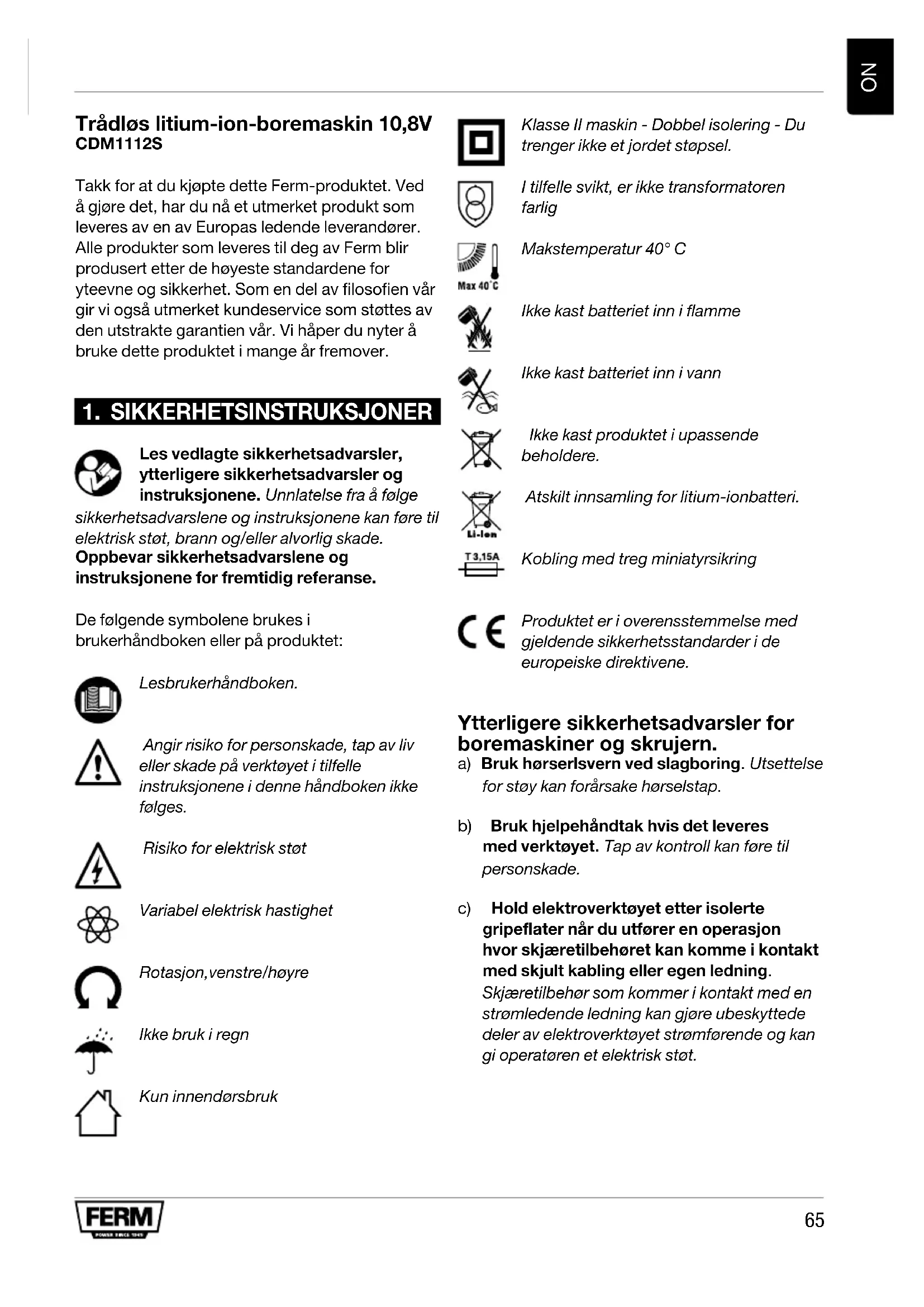 Trådløs litium-ion-boremaskin 10,8V CDM1112S Takk for at du kjøpte dette Ferm-produktet. Ved å gjøre det, har du nå et utmerket produkt som leveres av en av Europas ledende leverandører. Alle produkter som leveres til deg av Ferm blir produsert etter de høyeste standardene for yteevne og sikkerhet. Som en del av filosofien vår gir vi også utmerket kundeservice som støttes av den utstrakte garantien vår. Vi håper du nyter å bruke dette produktet i mange år fremover.