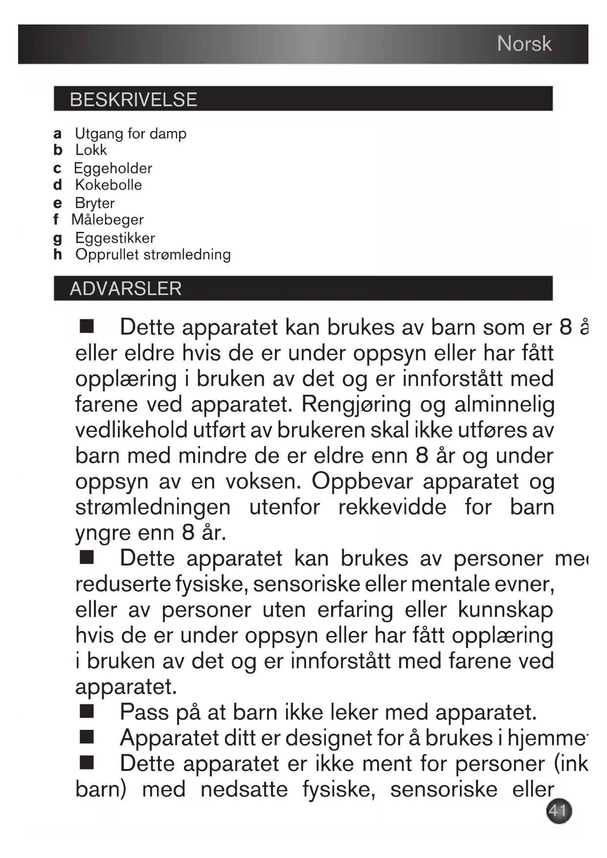 Apparatet må ikke brukes når det er tomt. For å unngå overoppheting av apparatet, må det ikke plasseres i et hjørne eller mot en vegg. Apparatet må aldri plasseres direkte på en skjør overflate (glassbord, duk, lakkert tre etc.) eller på en plastduk. Kjøkkenredskaper må aldri legges på stekeflatene i apparatet.44 Norsk INSTALLERING OPPSTART OG MATLAGING: Plasser kokeren på en stabil arbeidsoverflate. Rengjør apparatet (frakoblet) og delene med en fuktig klut. Tørk. Vi anbefaler at du bruker romtempererte egg. Du kan velge 3 koketider for eggene (1 til 7 egg). Avmerkingen på målebegeret er veiledende, resultatet avhenger av type og størrelse på eggene.