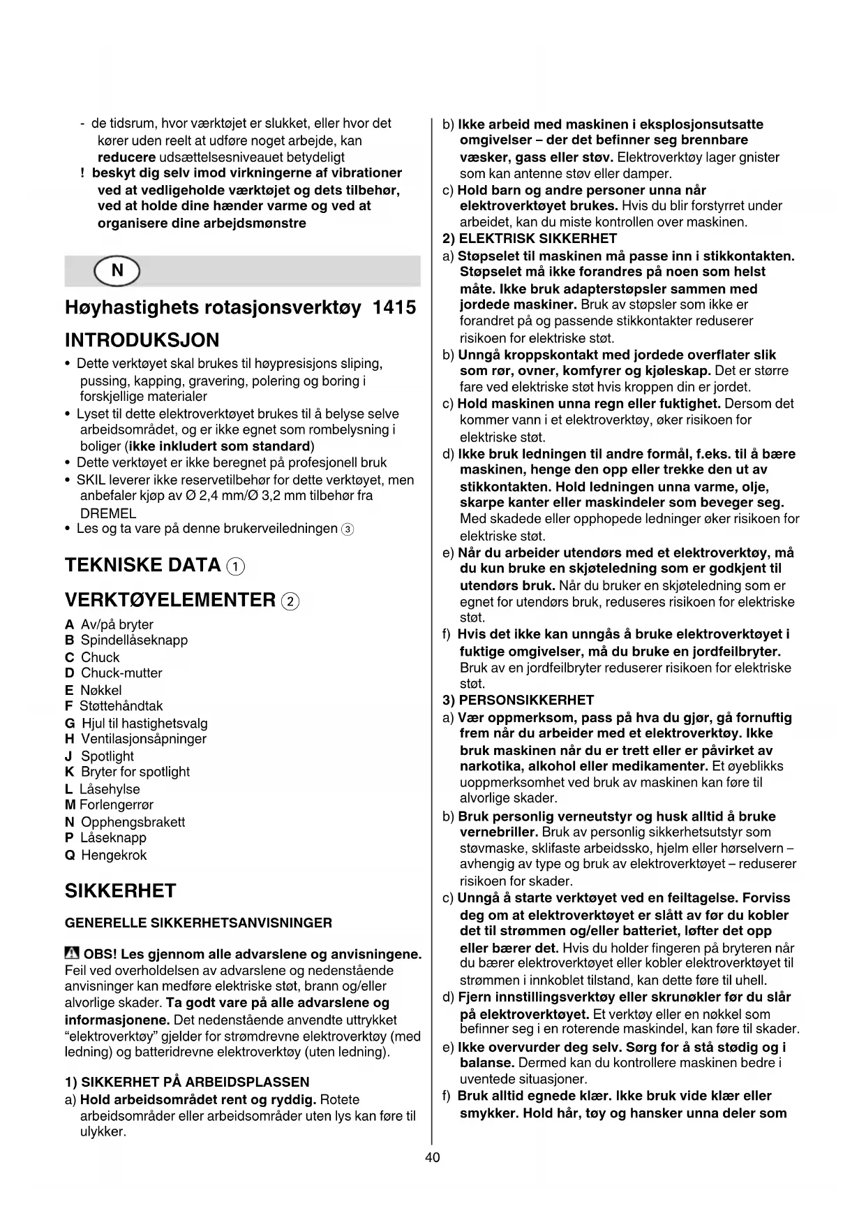 - Les og ta vare på denne brukerveiledningen 3 TEKNISKE DATA 1 VERKTØYELEMENTER 2 A Av/på bryter B Spindellåseknapp C Chuck D Chuck-mutter E Nøkkel F Støttehåndtak G Hjul til hastighetsvalg H Ventilasjonsåpninger J Spotlight K Bryter for spotlight L Låsehylse M Forlengerrør N Opphengsbrakett P Låseknapp Q Hengekrok SIKKERHET GENERELLE SIKKERHETSANVISNINGER OBS! Les gjennom alle advarslene og anvisningene. Feil ved overholdelsen av advarslene og nedenstående anvisninger kan medføre elektriske støt, brann og/eller alvorlige skader. Ta godt vare på alle advarslene og informasjonene. Det nedenstående anvendte uttrykket “elektroverktøy” gjelder for strømdrevne elektroverktøy (med ledning) og batteridrevne elektroverktøy (uten ledning).
