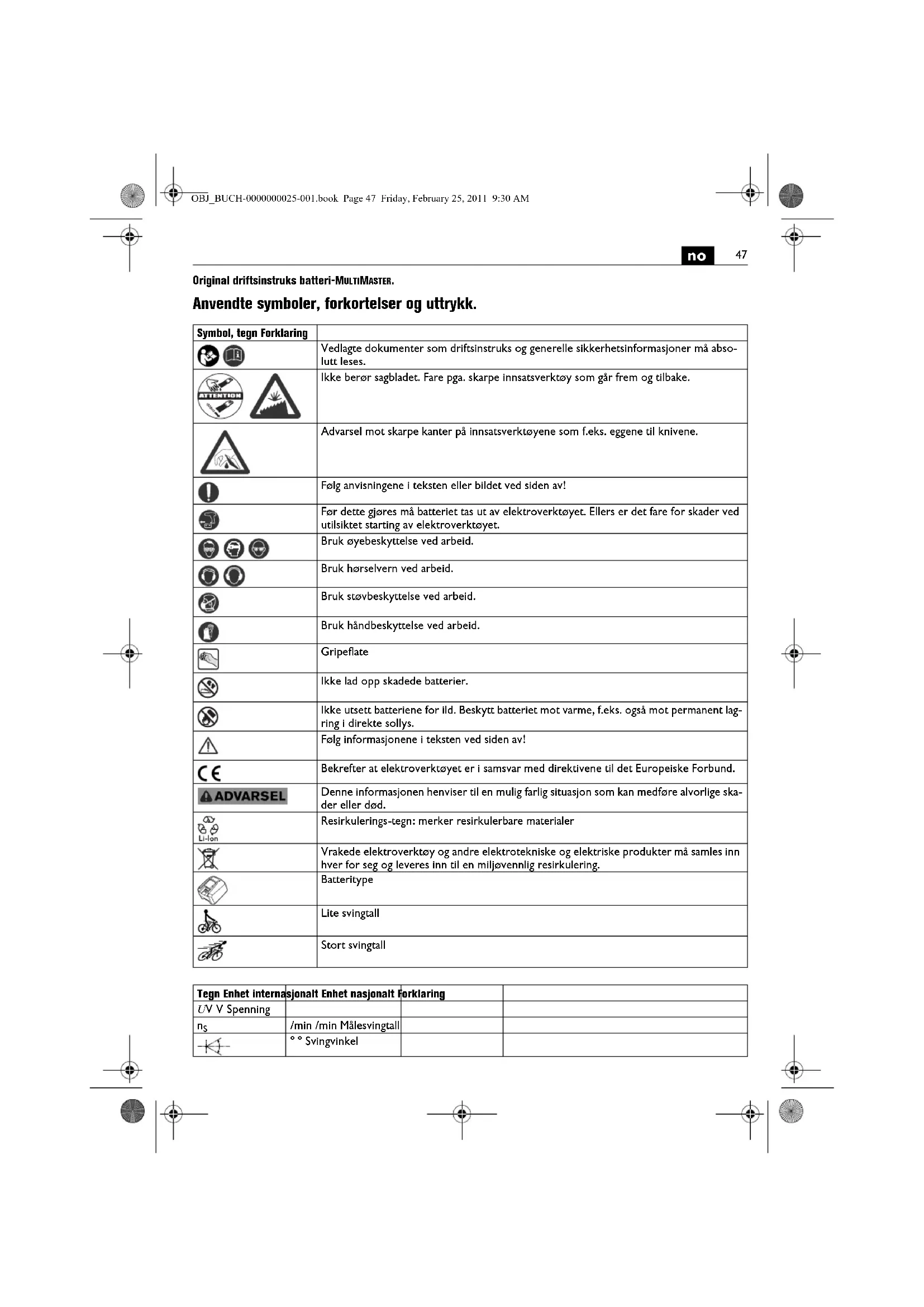 Original driftsinstruks batteri-MULTIMASTER. Anvendte symboler, forkortelser og uttrykk. Symbol, tegn Forklaring Vedlagte dokumenter som driftsinstruks og generelle sikkerhetsinformasjoner må abso- lutt leses. Ikke berør sagbladet. Fare pga. skarpe innsatsverktøy som går frem og tilbake. Advarsel mot skarpe kanter på innsatsverktøyene som f.eks. eggene til knivene. Følg anvisningene i teksten eller bildet ved siden av! Før dette gjøres må batteriet tas ut av elektroverktøyet. Ellers er det fare for skader ved utilsiktet starting av elektroverktøyet. Bruk øyebeskyttelse ved arbeid. Bruk hørselvern ved arbeid. Bruk støvbeskyttelse ved arbeid. Bruk håndbeskyttelse ved arbeid. Gripeflate Ikke lad opp skadede batterier. Ikke utsett batteriene for ild. Beskytt batteriet mot varme, f.eks. også mot permanent lag- ring i direkte sollys. Følg informasjonene i teksten ved siden av! Bekrefter at elektroverktøyet er i samsvar med direktivene til det Europeiske Forbund. Denne informasjonen henviser til en mulig farlig situasjon som kan medføre alvorlige ska- der eller død. Resirkulerings-tegn: merker resirkulerbare materialer Vrakede elektroverktøy og andre elektrotekniske og elektriske produkter må samles inn hver for seg og leveres inn til en miljøvennlig resirkulering. Batteritype Lite svingtall Stort svingtall Tegn Enhet internasjonalt Enhet nasjonalt Forklaring U V V Spenning
