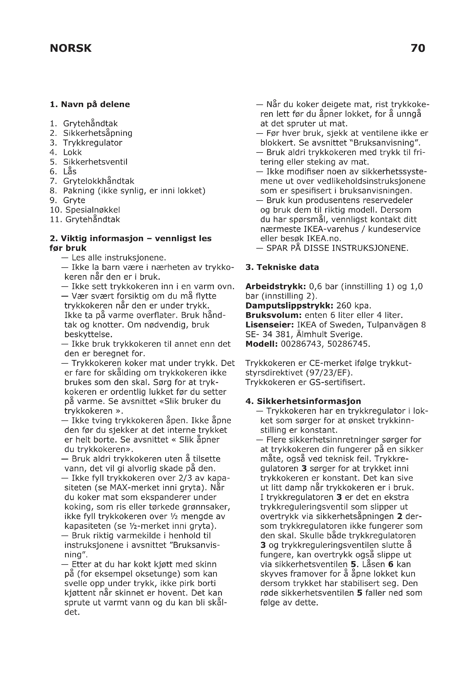 før bruk — Les alle instruksjonene. — Ikke la barn være i nærheten av trykko- keren når den er i bruk. — Ikke sett trykkokeren inn i en varm ovn. — Vær svært forsiktig om du må ytte trykkokeren når den er under trykk. Ikke ta på varme overater. Bruk hånd- tak og knotter. Om nødvendig, bruk beskyttelse. — Ikke bruk trykkokeren til annet enn det den er beregnet for. — Trykkokeren koker mat under trykk. Det er fare for skålding om trykkokeren ikke brukes som den skal. Sørg for at tryk- kokeren er ordentlig lukket før du setter på varme. Se avsnittet «Slik bruker du trykkokeren ». — Ikke tving trykkokeren åpen. Ikke åpne den før du sjekker at det interne trykket er helt borte. Se avsnittet « Slik åpner du trykkokeren». — Bruk aldri trykkokeren uten å tilsette vann, det vil gi alvorlig skade på den. — Ikke fyll trykkokeren over 2/3 av kapa- siteten (se MAX-merket inni gryta). Når du koker mat som ekspanderer under koking, som ris eller tørkede grønnsaker, ikke fyll trykkokeren over ½ mengde av kapasiteten (se ½-merket inni gryta). — Bruk riktig varmekilde i henhold til instruksjonene i avsnittet ”Bruksanvis- ning”. — Etter at du har kokt kjøtt med skinn på (for eksempel oksetunge) som kan svelle opp under trykk, ikke pirk borti kjøttent når skinnet er hovent. Det kan sprute ut varmt vann og du kan bli skål- det. — Når du koker deigete mat, rist trykkoke- ren lett før du åpner lokket, for å unngå at det spruter ut mat. — Før hver bruk, sjekk at ventilene ikke er blokkert. Se avsnittet “Bruksanvisning”. — Bruk aldri trykkokeren med trykk til fri- tering eller steking av mat. — Ikke modiser noen av sikkerhetssyste- mene ut over vedlikeholdsinstruksjonene som er spesisert i bruksanvisningen. — Bruk kun produsentens reservedeler og bruk dem til riktig modell. Dersom du har spørsmål, vennligst kontakt ditt nærmeste IKEA-varehus / kundeservice eller besøk IKEA.no. — SPAR PÅ DISSE INSTRUKSJONENE.