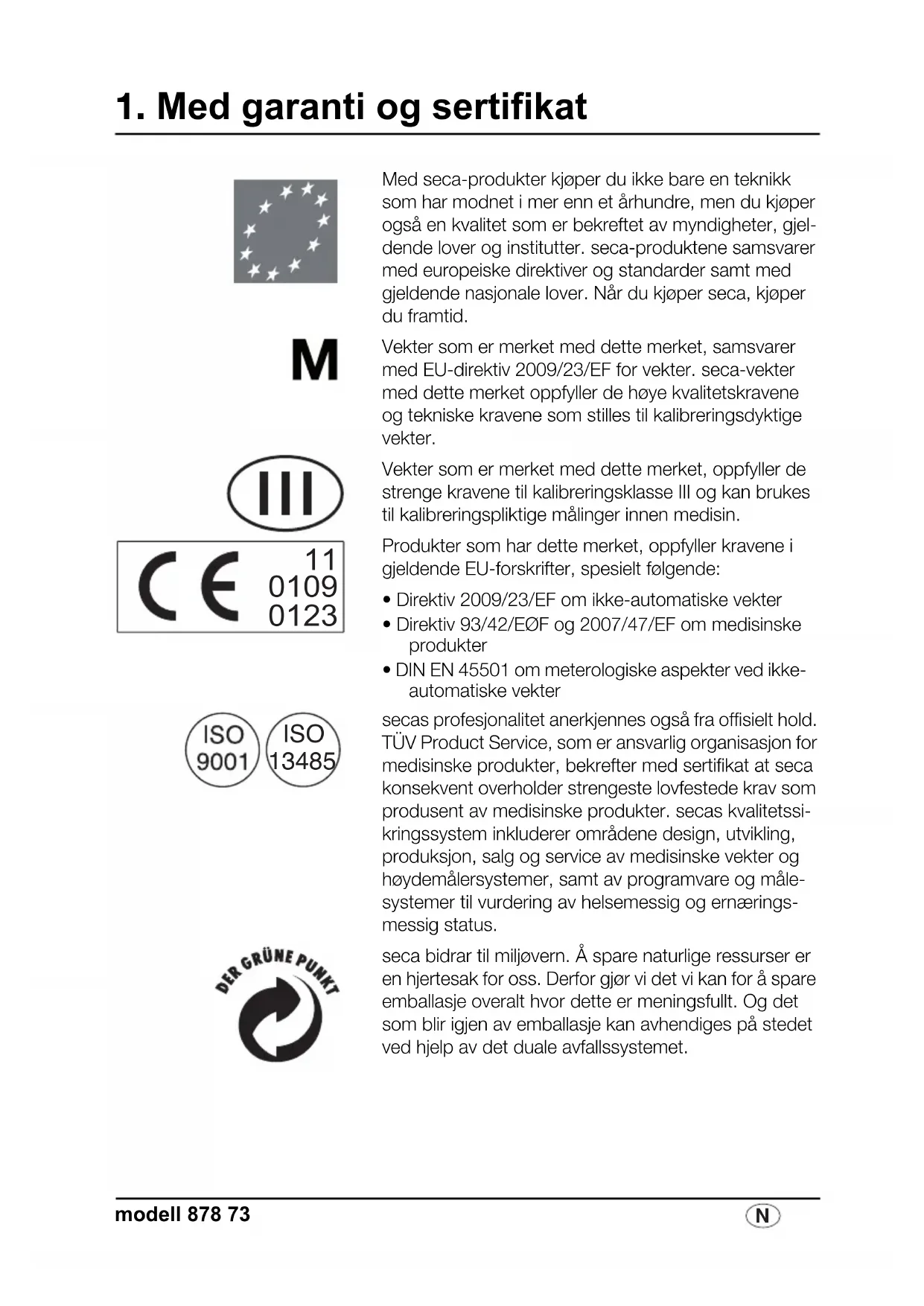 Vekter som er merket med dette merket, samsvarer med EU-direktiv 2009/23/EF for vekter. seca-vekter med dette merket oppfyller de høye kvalitetskravene og tekniske kravene som stilles til kalibreringsdyktige vekter.