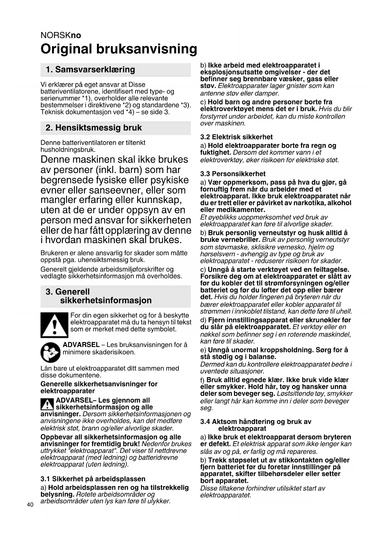 a) Vær oppmerksom, pass på hva du gjør, gå fornuftig frem när du arbeider med et elektroapparat. Ikke bruk elektroapparatet när du er trett eller er pvävirket av narkotika, alkohol eller medikamenteer.