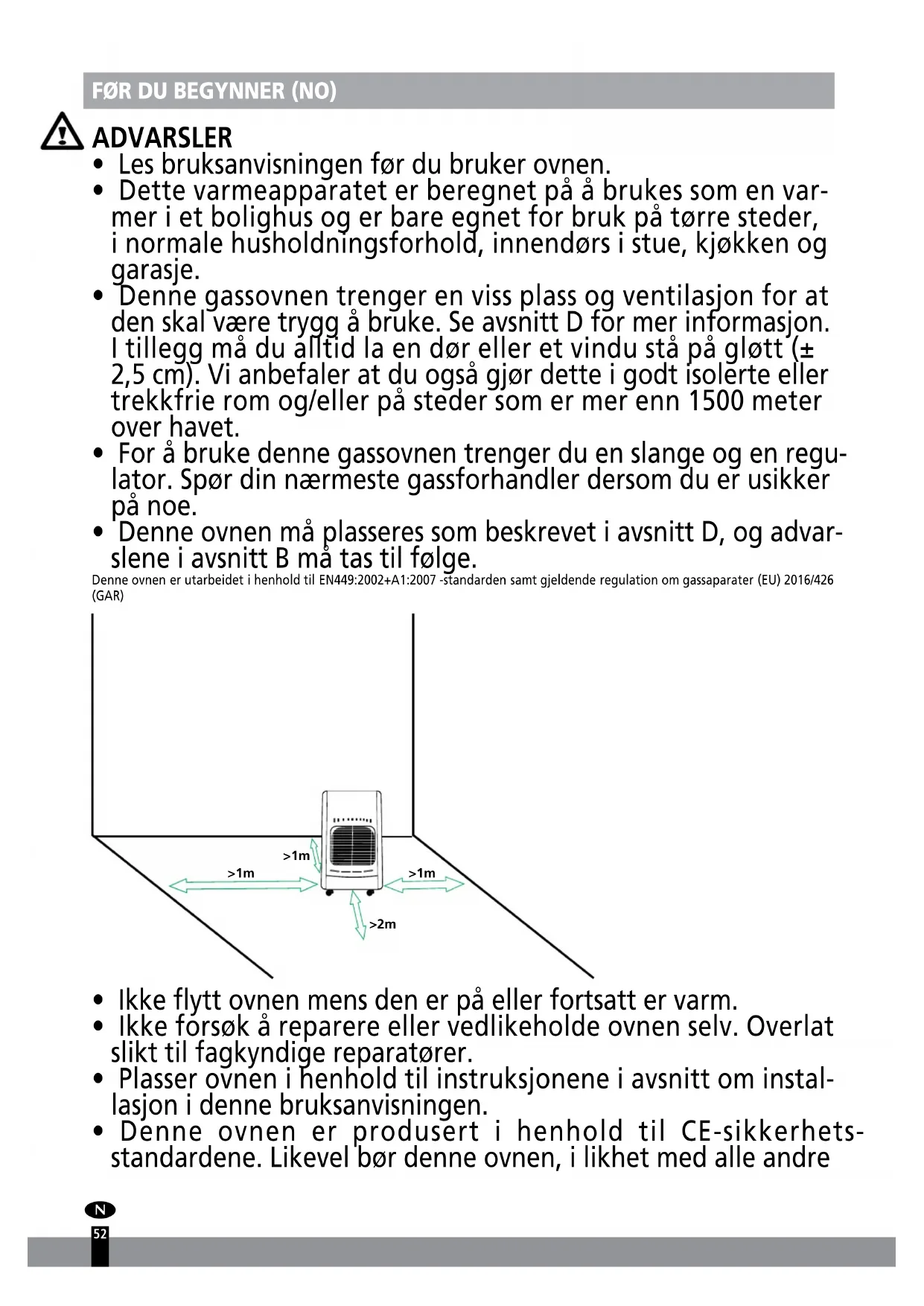 - Sett aldri gassovnen for nær andre varmekilder (minimum én meters avstand mellom gassovnen og andre varmekilder) eller lettantennelige/ eksplosive materialer. Se til at gassovnen ikke står vendt mot gjenstander som kan ta skade eller bli brent når den er på.