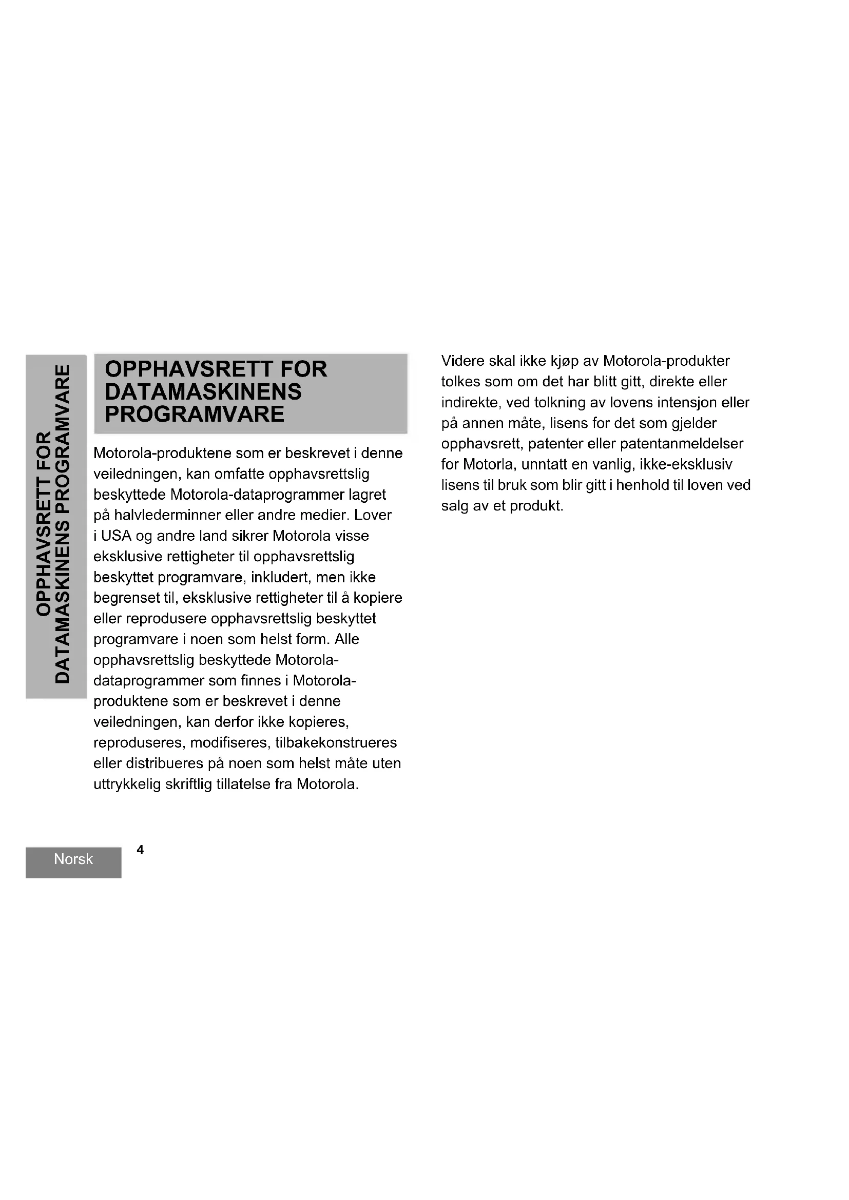 OPPHAVSRETT FOR DATAMASKINENS PROGRAMVARE OPPHAVSRETT FOR DATAMASKINENS PROGRAMVARE Motorola-produktene som er beskrevet i denne veiledningen, kan omfatte opphavsrettslig beskyttede Motorola-dataprogrammer lagret på halvlederminner eller andre medier. Lover i USA og andre land sikrer Motorola visse eksklusive rettigheter til opphavsrettslig beskyttet programvare, inkludert, men ikke begrenset til, eksklusive rettigheter til å kopiere eller reprodusere opphavsrettslig beskyttet programvare i noen som helst form. Alle opphavsrettslig beskyttede Motorola- dataprogrammer som finnes i Motorola- produktene som er beskrevet i denne veiledningen, kan derfor ikke kopieres, reproduseres, modifiseres, tilbakekonstrueres eller distribueres på noen som helst måte uten uttrykkelig skriftlig tillatelse fra Motorola. Videre skal ikke kjøp av Motorola-produkter tolkes som om det har blitt gitt, direkte eller indirekte, ved tolkning av lovens intensjon eller på annen måte, lisens for det som gjelder opphavsrett, patenter eller patentanmeldelser for Motorla, unntatt en vanlig, ikke-eksklusiv lisens til bruk som blir gitt i henhold til loven ved salg av et produkt.Norsk