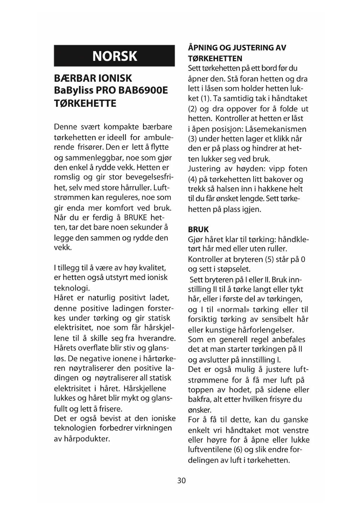 TØRKEHETTEN Sett tørkehetten på ett bord før du åpner den. Stå foran hetten og dra lett i låsen som holder hetten luk- ket (1). Ta samtidig tak i håndtaket (2) og dra oppover for å folde ut hetten. Kontroller at hetten er låst i åpen posisjon: Låsemekanismen (3) under hetten lager et klikk når den er på plass og hindrer at het- ten lukker seg ved bruk. Justering av høyden: vipp foten (4) på tørkehetten litt bakover og trekk så halsen inn i hakkene helt til du får ønsket lengde. Sett tørke- hetten på plass igjen. BRUK Gjør håret klar til tørking: håndkle- tørt hår med eller uten ruller. Kontroller at bryteren (5) står på 0 og sett i støpselet. Sett bryteren på I eller II. Bruk inn- stilling II til å tørke langt eller tykt hår, eller i første del av tørkingen, og I til «normal» tørking eller til forsiktig tørking av sensibelt hår eller kunstige hårforlengelser. Som en generell regel anbefales det at man starter tørkingen på II og avslutter på innstilling I. Det er også mulig å justere luft- strømmene for å få mer luft på toppen av hodet, på sidene eller bakfra, alt etter hvilken frisyre du ønsker. For å få til dette, kan du ganske enkelt vri håndtaket mot venstre eller høyre for å åpne eller lukke luftventilene (6) og slik endre for- delingen av luft i tørkehetten.31