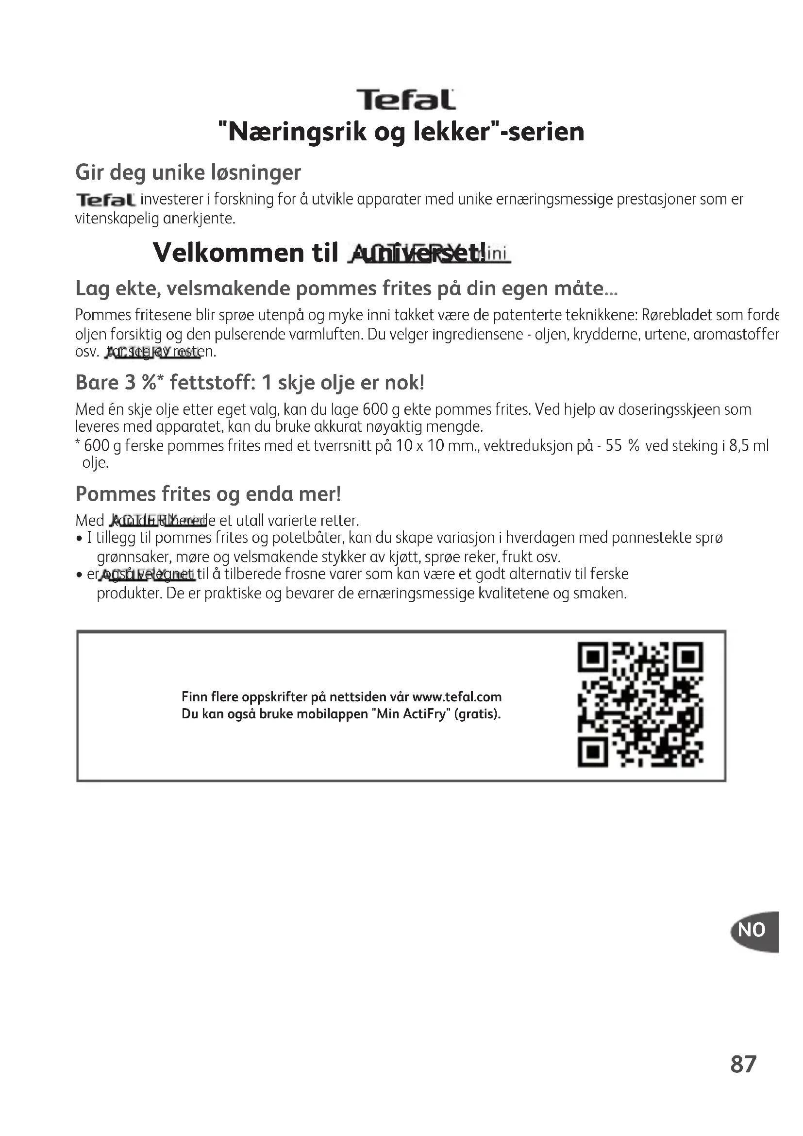"Næringsrik og lekker"-serien Gir deg unike løsninger investerer i forskning for å utvikle apparater med unike ernæringsmessige prestasjoner som ervitenskapelig anerkjente. Velkommen til -universet! Lag ekte, velsmakende pommes frites på din egen måte... Pommes fritesene blir sprøe utenpå og myke inni takket være de patenterte teknikkene: Rørebladet som fordeleroljen forsiktig og den pulserende varmluften. Du velger ingrediensene - oljen, krydderne, urtene, aromastoffeneosv. tar seg av resten. Bare 3 %* fettstoff: 1 skje olje er nok! Med én skje olje etter eget valg, kan du lage 600 g ekte pommes frites. Ved hjelp av doseringsskjeen somleveres med apparatet, kan du bruke akkurat nøyaktig mengde.* 600 g ferske pommes frites med et tverrsnitt på 10 x 10 mm., vektreduksjon på - 55 % ved steking i 8,5 mlolje. Pommes frites og enda mer! Med kan du tilberede et utall varierte retter.• I tillegg til pommes frites og potetbåter, kan du skape variasjon i hverdagen med pannestekte sprøgrønnsaker, møre og velsmakende stykker av kjøtt, sprøe reker, frukt osv.• er også velegnet til å tilberede frosne varer som kan være et godt alternativ til ferskeprodukter. De er praktiske og bevarer de ernæringsmessige kvalitetene og smaken.Finn flere oppskrifter på nettsiden vår www.tefal.comDu kan også bruke mobilappen "Min ActiFry" (gratis).88 Viktige anbefalinger Steking