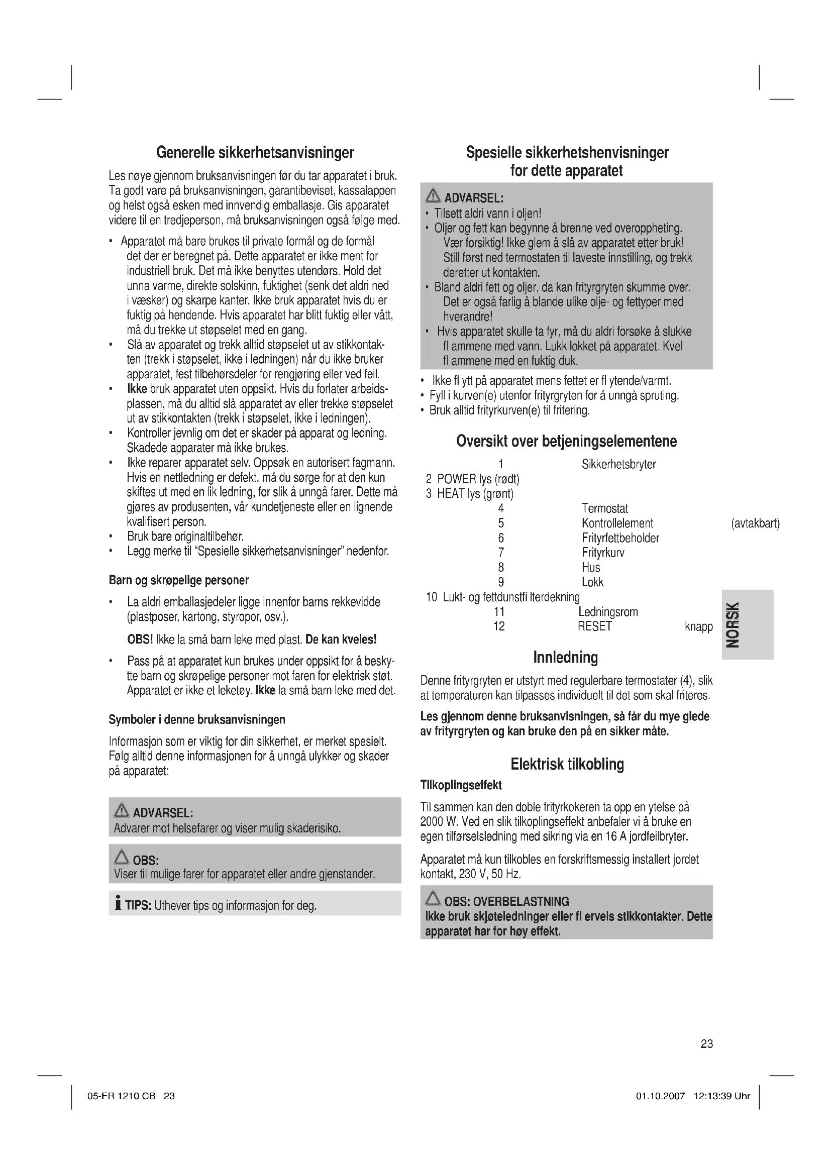 - „RESET“-knappen (12) bak på kontrollelementet må kun betjenes etter at apparatet er fullstendig avkjølt. Denne knappen starter frityrkokeren opp på ny. Benytt en spiss gjenstand for å betjene knappen. Tekniske data Modell: ........................................................................FR 1210 CB Spenningsforsyning: .......................................... 220-240 V, 50 Hz Inngangsstrøm: .................................................................2000 W Beskyttelsesklasse: ...................................................................... Ι Påfyllingsmengde: ...................................................maks. 4,0 liter Nettovekt: .............................................................................4,1 kg Dette apparatet har blitt testet i henhold til alle aktuelle CE- retningslinjer som det rammes av, f.eks. elektromagnetisk toleranse og direktiver om lavspenning. Det er laget i henhold til dagens nyeste sikkerhetstekniske forskrifter. Med forbehold om tekniske endringer! Garanti For apparat som vi har solgt, påtar vi oss en garanti på 24 måneder fra kjøpsdato (kassalapp). Innenfor garantitiden fjerner vi mangler på apparat eller tilbehør uten omkostninger hvis manglene skyldes material- eller produksjonsfeil. Dette gjør vi ved reparasjon eller – etter vår vurdering – bytting. Garantiytelser medfører ingen forlengelse av garantitiden, og det oppstår heller ikke noe krav på en ny garanti på grunn av dette! Som garantibevis gjelder kjøpsbeviset. Uten dette beviset kan du ikke få byttet eller reparert apparatet gratis. I forbindelse med garanti ber vi om at du gir hele apparatet i ori- ginalemballasjen sammen med kassalappen til din forhandler. Verken defekter på forbrukstilbehør og slitasjedeler eller rengjø- ring, vedlikehold og utskifting av slitasjedeler går inn under garantien. Slike ting er derfor kostnadspliktige! Garantien utgår ved inngrep utenfra. Etter garantien Etter at garantitiden har gått ut, kan reparasjoner utføres av den aktuelle faghandelen eller reparasjonsservice mot betaling. 05-FR 1210 CB 2505-FR 1210 CB 25 01.10.2007 12:13:40 Uhr01.10.2007 12:13:40 UhrENGLISH ENGLISH