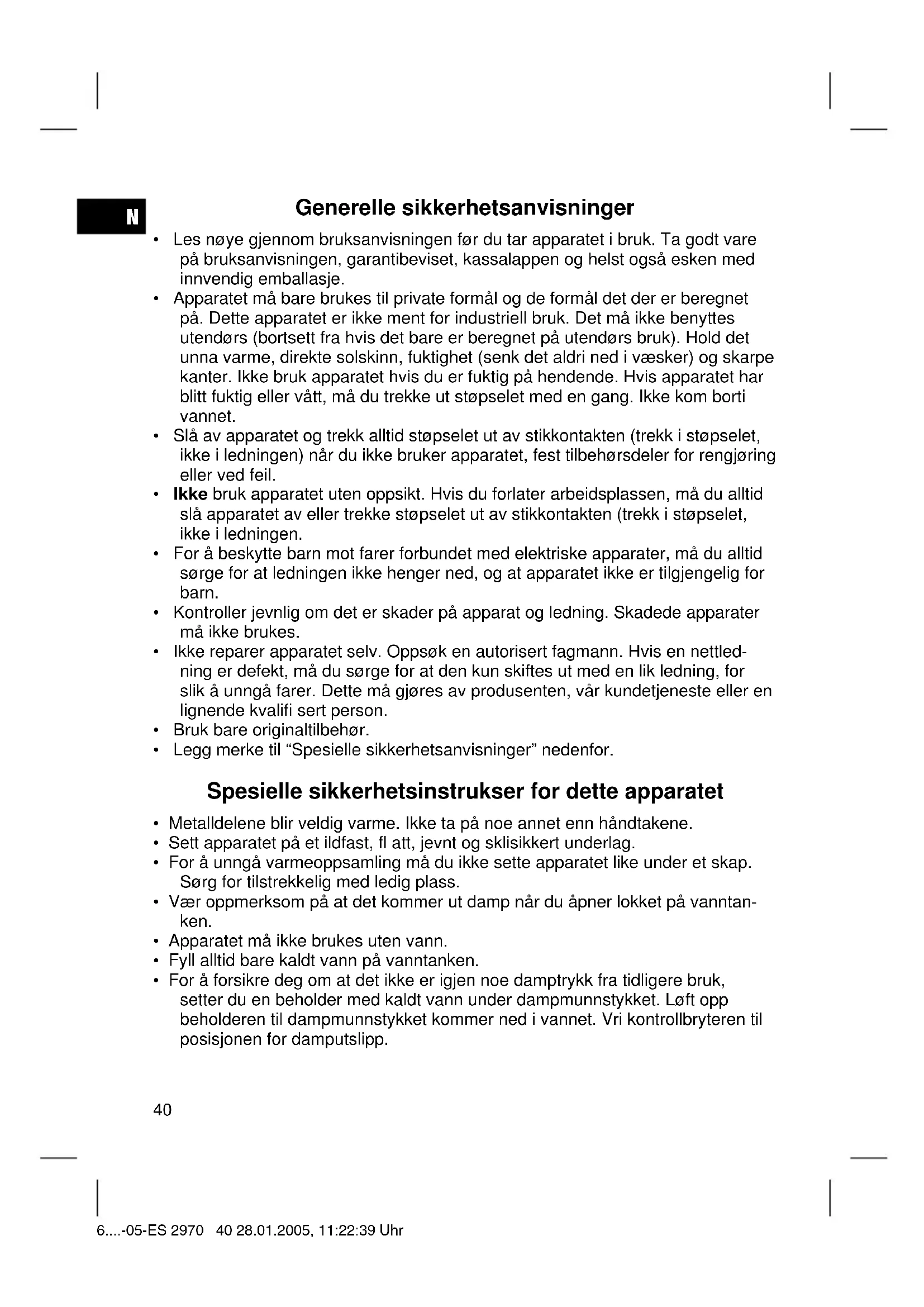 - For å forsikre deg om at det ikke er igjen noe damptrykk fra tidligere bruk, setter du en beholder med kaldt vann under dampmunnstykket. Løft opp beholderen til dampmunnstykket kommer ned i vannet. Vri kontrollbryteren til posisjonen for damputslipp. 6....-05-ES 2970 40 28.01.2005, 11:22:39 UhrN