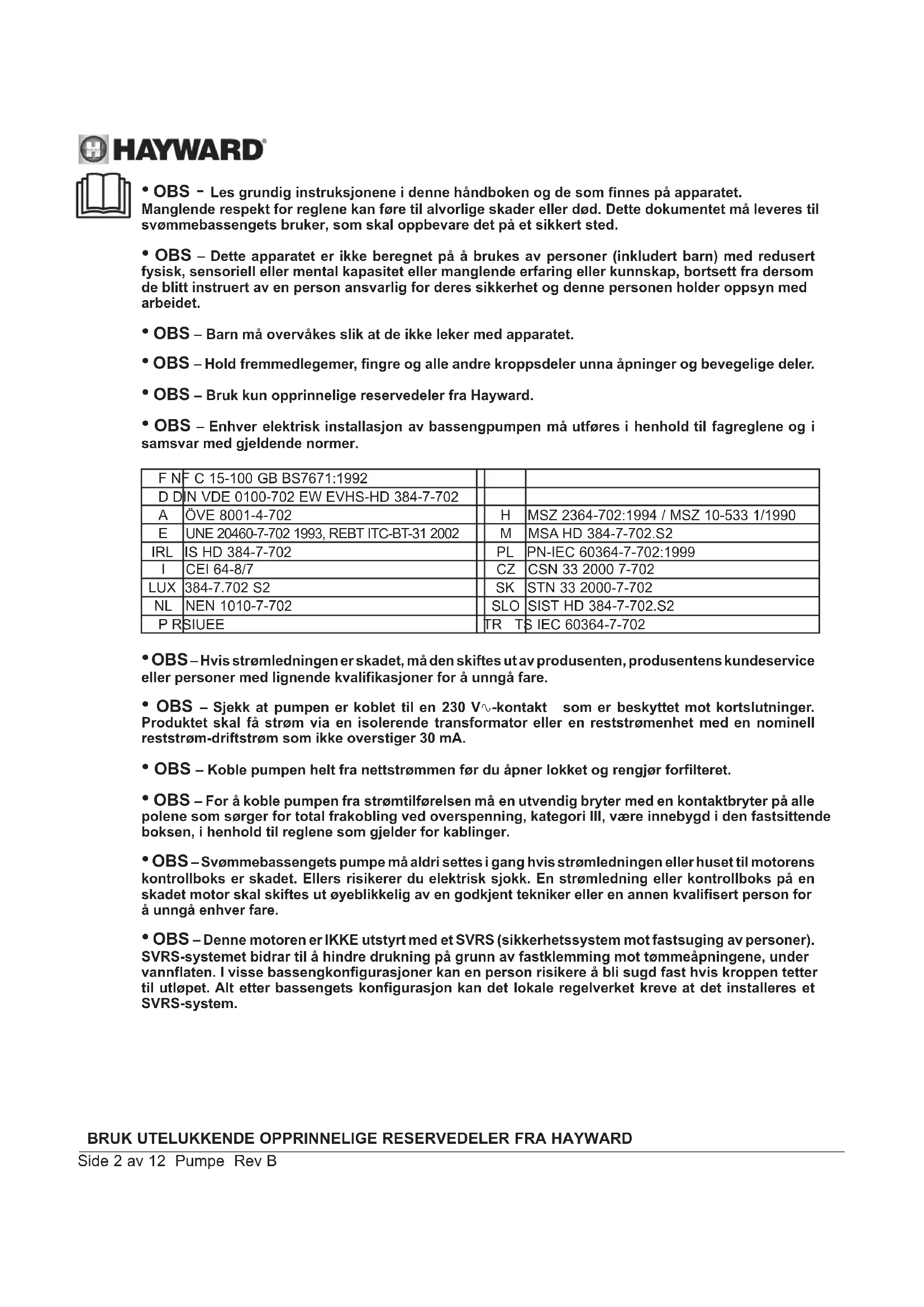 - OBS – Denne motoren er IKKE utstyrt med et SVRS (sikkerhetssystem mot fastsuging av personer). SVRS-systemet bidrar til å hindre drukning på grunn av fastklemming mot tømmeåpningene, under vannflaten. I visse bassengkonfigurasjoner kan en person risikere å bli sugd fast hvis kroppen tetter til utløpet. Alt etter bassengets konfigurasjon kan det lokale regelverket kreve at det installeres et SVRS-system.BRUK UTELUKKENDE OPPRINNELIGE RESERVEDELER FRA HAYWARD Side 3 av 12 Pumpe Rev B GENERELT Gratulerer, du har nettopp kjøpt en Hayward-pumpe med variabel hastighet