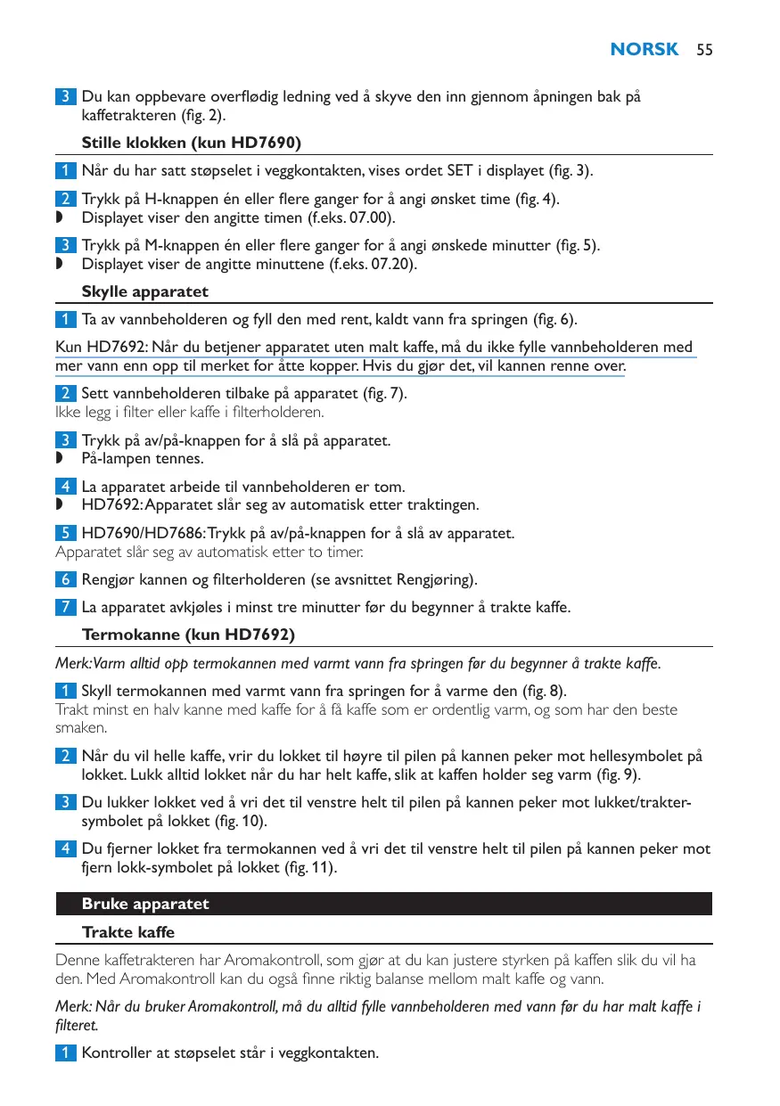 Norsk 2 Kontroller at glasskannen eller termokannen (med lokket i posisjonen lukket/trakter r) står under filterholderen. 3 Angi kaffestyrken du foretrekker med Aromakontroll-bryteren. (fig. 12) Hvis du vil heve kaffestyrken, vrir du bryteren til høyre. Hvis du vil senke kaffestyrken, vrir du bryteren til venstre. Merk: Når du angir kaffestyrken, må du kontrollere at filterholderen står i apparatet. 4 Ta av vannbeholderen og fyll den med rent, kaldt vann fra springen (fig. 6). Nivåindikasjonene tilsvarer kopper på 120 ml. 5 Sett vannbeholderen ordentlig tilbake på apparatet (fig. 7). , Aromakontroll-indikatoren beveger seg oppover. 6 Ta et papirfilter (type 1x4 eller nr. 4), og brett kantene på det for å forhindre folder og rifter. Merk: Hvis du vil bruke Aromakontroll til å finne riktig balanse mellom malt kaffe og vann, må du ikke bruke et permanent filter. På grunn av vekten forstyrrer et permanent filter kaffe-vann-balansen for Aromakontroll. 7 Åpne filterholderlokket og plasser et papirfilter i filterholderen (fig. 13). 8 Ha i malt kaffe (filtermalt) i filteret til Aromakontroll-indikatoren står i OK-posisjon, og lukke filterholderlokket (fig. 14). 9 Trykk på av/på-knappen for å slå på apparatet. , Den røde på-lampen lyser. 10 Når alt vannet har rent gjennom filteret, kan du ta kannen av varmeplaten. Hvis du fjerner muggen i mer enn 30 sekunder før alt vannet har gått gjennom filteret, kan filteret renne over.