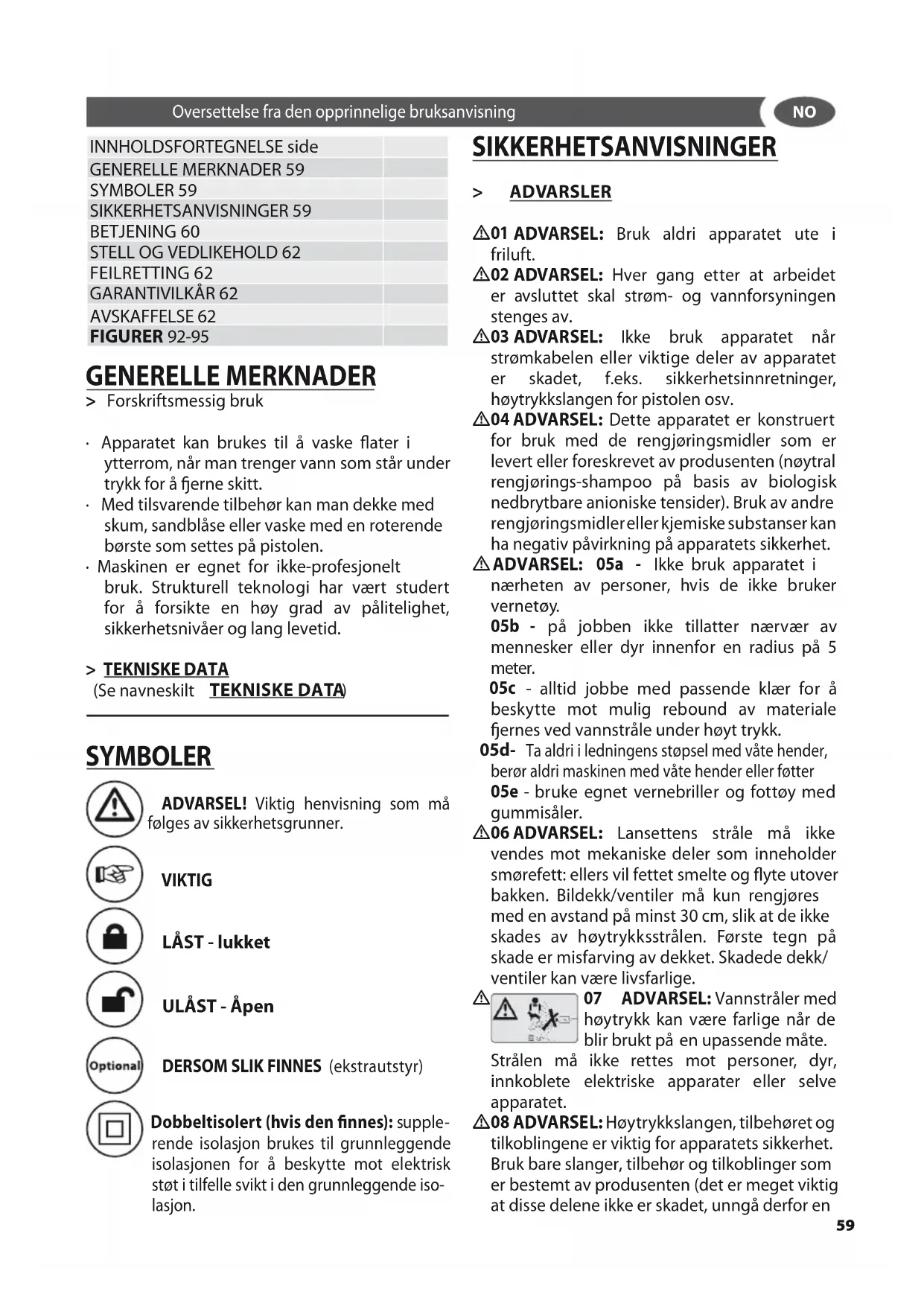 ADVARSEL: Vannstråler med høytrykk kan være farlige når de blir brukt på en upassende måte. Strålen må ikke rettes mot personer, dyr, innkoblete elektriske apparater eller selve apparatet.