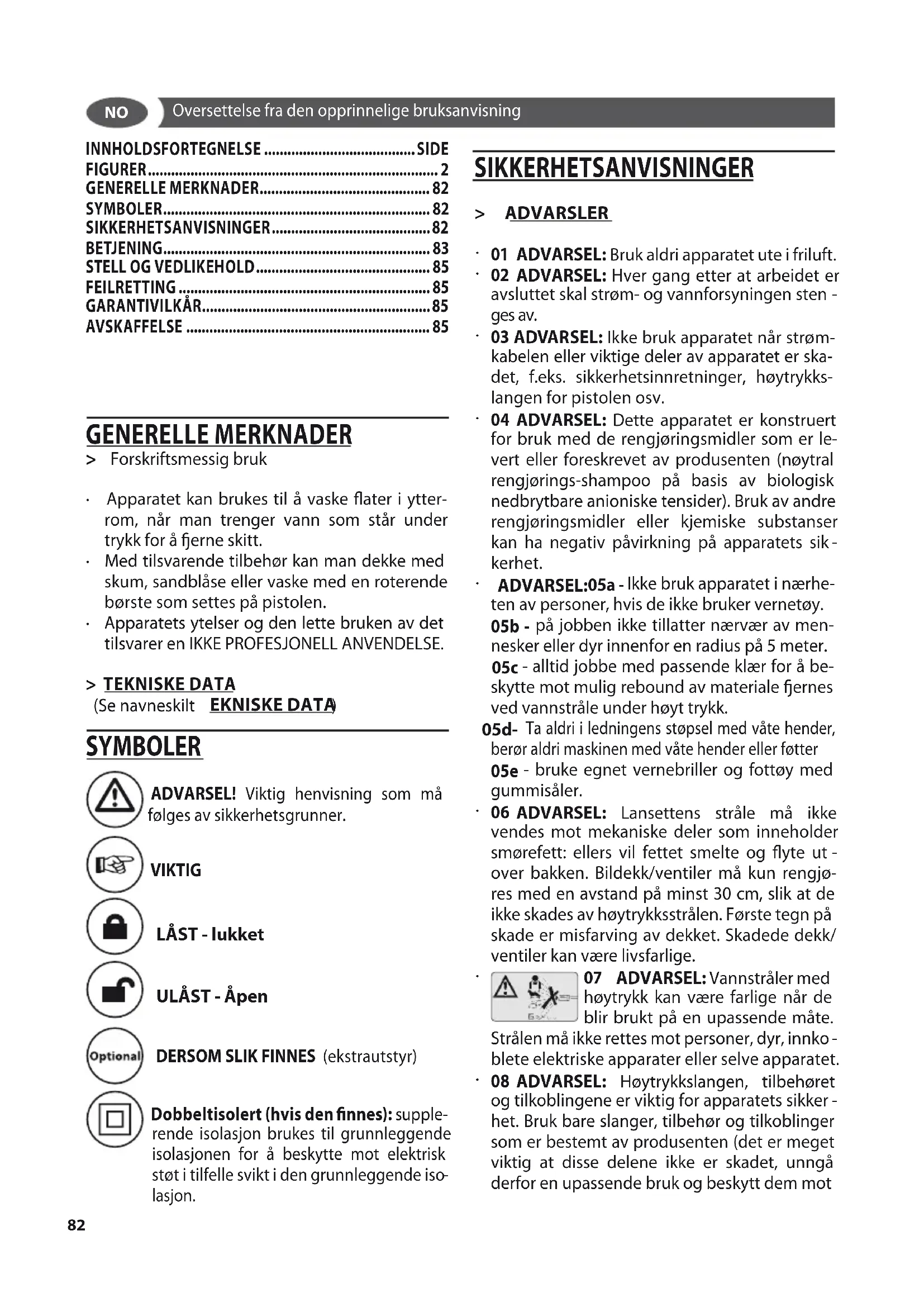 SYMBOLER ADVARSEL! Viktig henvisning som må følges av sikkerhetsgrunner. VIKTIG LÅST - lukket ULÅST - Åpen DERSOM SLIK FINNES (ekstrautstyr) Dobbeltisolert (hvis den finnes): supple- rende isolasjon brukes til grunnleggende isolasjonen for å beskytte mot elektrisk støt i tilfelle svikt i den grunnleggende iso
