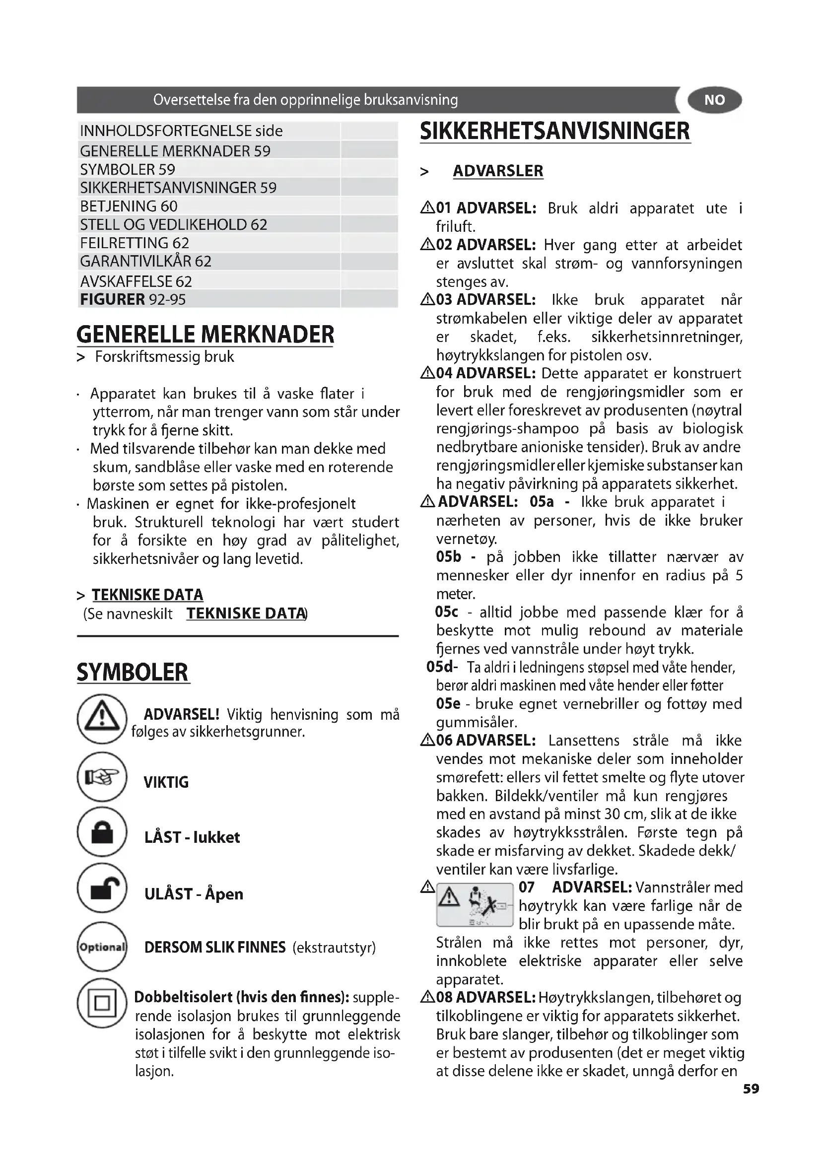 ADVARSEL: Vannstråler med høytrykk kan være farlige når de blir brukt på en upassende måte. Strålen må ikke rettes mot personer, dyr, innkoblete elektriske apparater eller selve apparatet.