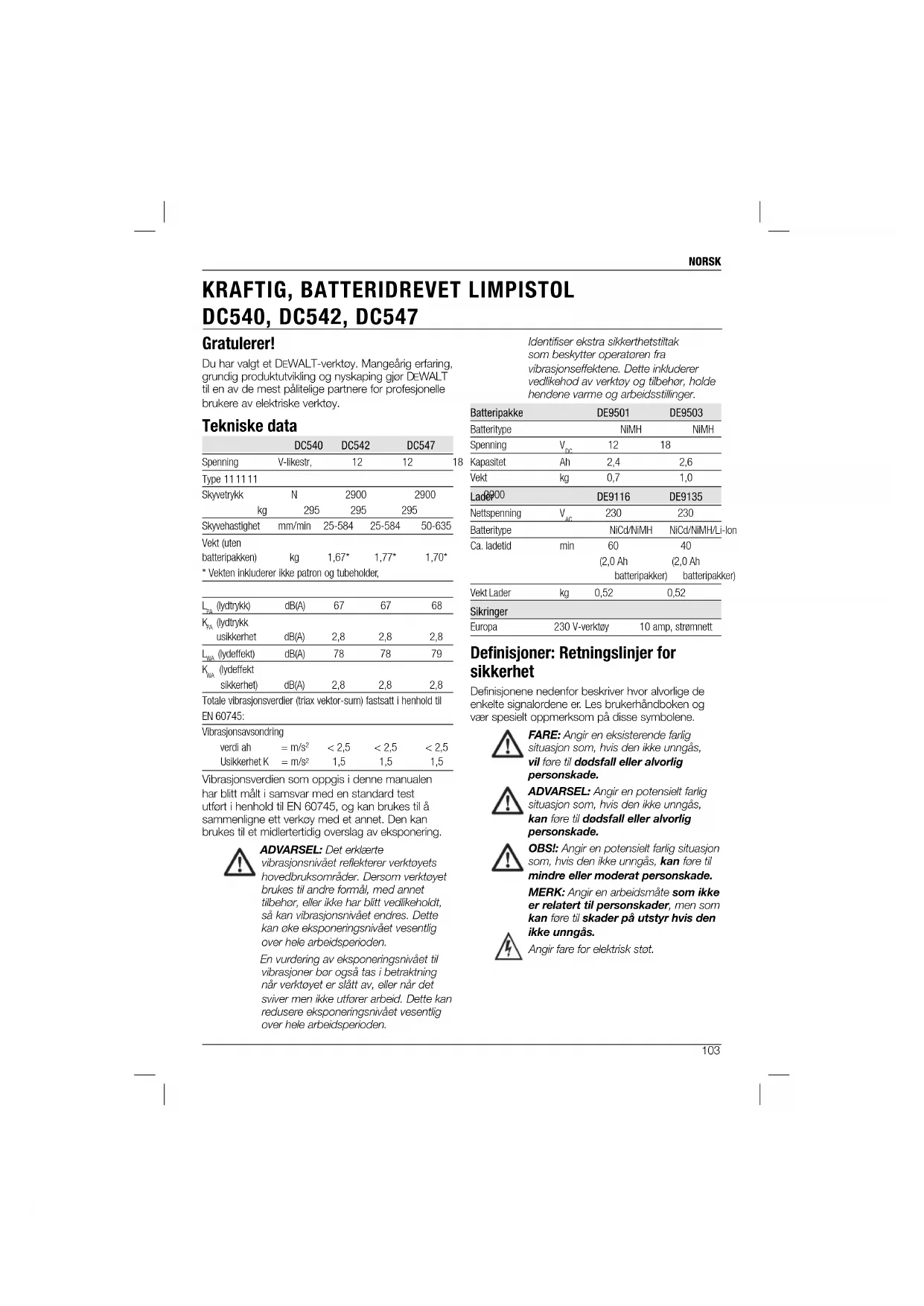 DC540, DC542, DC547 Identifiser ekstra sikkerthetstiltak som beskytter operatøren fra vibrasjonseffektene. Dette inkluderer vedlikehod av verktøy og tilbehør, holde hendene varme og arbeidsstillinger. Batteripakke DE9501 DE9503 Batteritype NiMH NiMH Spenning V