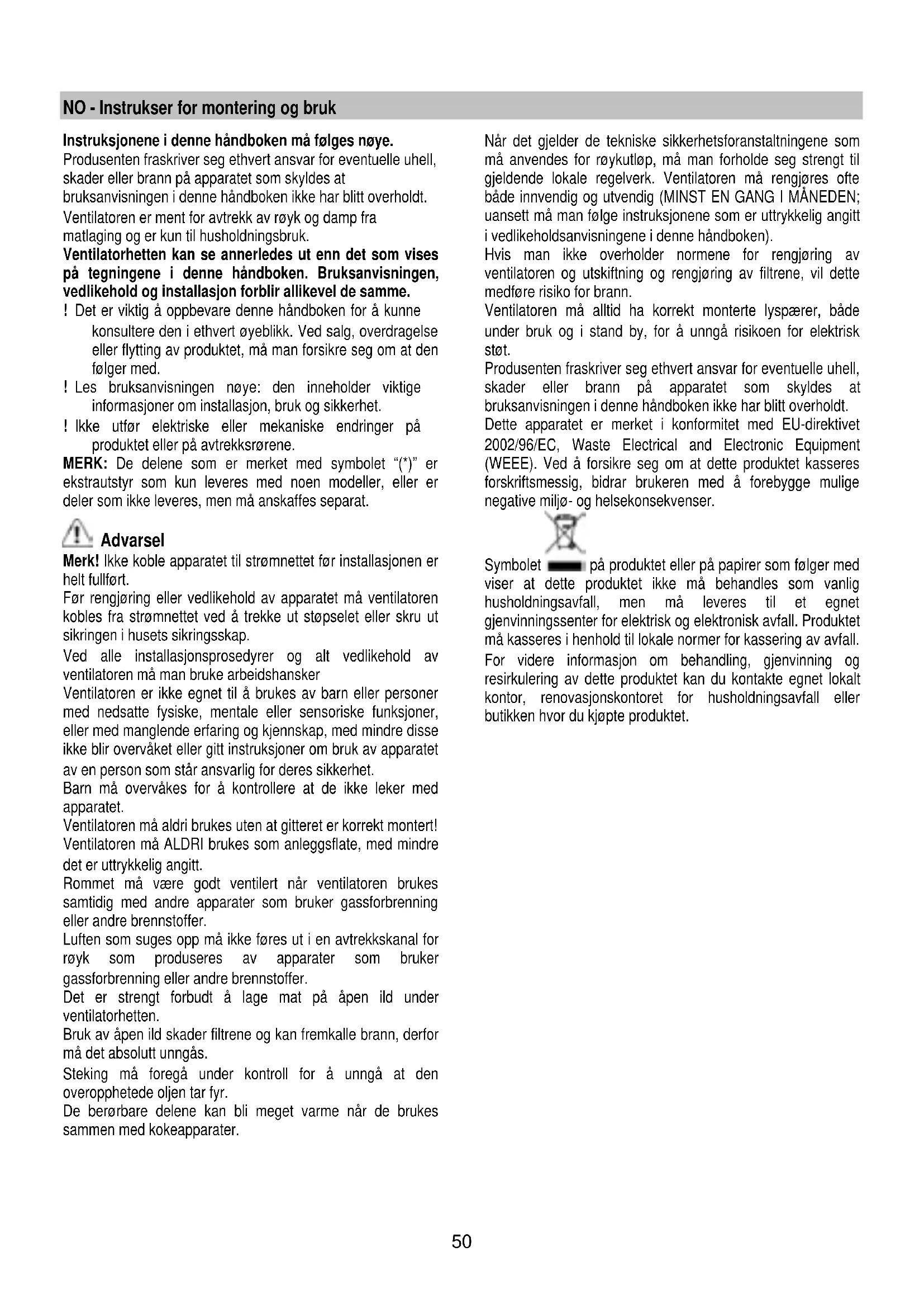 Jos valaistus ei toimi, tarkista että lamput on asennettu oikein paikoilleen ennen kuin otat yhteyttä tekniseen tukeen.50 NO - Instrukser for montering og bruk Instruksjonene i denne håndboken må følges nøye. Produsenten fraskriver seg ethvert ansvar for eventuelle uhell, skader eller brann på apparatet som skyldes at bruksanvisningen i denne håndboken ikke har blitt overholdt. Ventilatoren er ment for avtrekk av røyk og damp fra matlaging og er kun til husholdningsbruk. Ventilatorhetten kan se annerledes ut enn det som vises på tegningene i denne håndboken. Bruksanvisningen, vedlikehold og installasjon forblir allikevel de samme. ! Det er viktig å oppbevare denne håndboken for å kunne konsultere den i ethvert øyeblikk. Ved salg, overdragelse eller flytting av produktet, må man forsikre seg om at den følger med. ! Les bruksanvisningen nøye: den inneholder viktige informasjoner om installasjon, bruk og sikkerhet. ! Ikke utfør elektriske eller mekaniske endringer på produktet eller på avtrekksrørene. MERK: De delene som er merket med symbolet “(*)” er ekstrautstyr som kun leveres med noen modeller, eller er deler som ikke leveres, men må anskaffes separat. Advarsel Merk! Ikke koble apparatet til strømnettet før installasjonen er helt fullført. Før rengjøring eller vedlikehold av apparatet må ventilatoren kobles fra strømnettet ved å trekke ut støpselet eller skru ut sikringen i husets sikringsskap. Ved alle installasjonsprosedyrer og alt vedlikehold av ventilatoren må man bruke arbeidshansker Ventilatoren er ikke egnet til å brukes av barn eller personer med nedsatte fysiske, mentale eller sensoriske funksjoner, eller med manglende erfaring og kjennskap, med mindre disse ikke blir overvåket eller gitt instruksjoner om bruk av apparatet av en person som står ansvarlig for deres sikkerhet. Barn må overvåkes for å kontrollere at de ikke leker med apparatet. Ventilatoren må aldri brukes uten at gitteret er korrekt montert! Ventilatoren må ALDRI brukes som anleggsflate, med mindre det er uttrykkelig angitt. Rommet må være godt ventilert når ventilatoren brukes samtidig med andre apparater som bruker gassforbrenning eller andre brennstoffer. Luften som suges opp må ikke føres ut i en avtrekkskanal for røyk som produseres av apparater som bruker gassforbrenning eller andre brennstoffer. Det er strengt forbudt å lage mat på åpen ild under ventilatorhetten. Bruk av åpen ild skader filtrene og kan fremkalle brann, derfor må det absolutt unngås. Steking må foregå under kontroll for å unngå at den overopphetede oljen tar fyr. De berørbare delene kan bli meget varme når de brukes sammen med kokeapparater. Når det gjelder de tekniske sikkerhetsforanstaltningene som må anvendes for røykutløp, må man forholde seg strengt til gjeldende lokale regelverk. Ventilatoren må rengjøres ofte både innvendig og utvendig (MINST EN GANG I MÅNEDEN; uansett må man følge instruksjonene som er uttrykkelig angitt i vedlikeholdsanvisningene i denne håndboken). Hvis man ikke overholder normene for rengjøring av ventilatoren og utskiftning og rengjøring av filtrene, vil dette medføre risiko for brann. Ventilatoren må alltid ha korrekt monterte lyspærer, både under bruk og i stand by, for å unngå risikoen for elektrisk støt. Produsenten fraskriver seg ethvert ansvar for eventuelle uhell, skader eller brann på apparatet som skyldes at bruksanvisningen i denne håndboken ikke har blitt overholdt. Dette apparatet er merket i konformitet med EU-direktivet 2002/96/EC, Waste Electrical and Electronic Equipment (WEEE). Ved å forsikre seg om at dette produktet kasseres forskriftsmessig, bidrar brukeren med å forebygge mulige negative miljø- og helsekonsekvenser. Symbolet på produktet eller på papirer som følger med viser at dette produktet ikke må behandles som vanlig husholdningsavfall, men må leveres til et egnet gjenvinningssenter for elektrisk og elektronisk avfall. Produktet må kasseres i henhold til lokale normer for kassering av avfall. For videre informasjon om behandling, gjenvinning og resirkulering av dette produktet kan du kontakte egnet lokalt kontor, renovasjonskontoret for husholdningsavfall eller butikken hvor du kjøpte produktet.51 Bruksmåte Ventilatorhetten er laget for å brukes med direkte avtrekk der avtrekksluften føres ut i friluft, eller med resirkulering av avtrekksluften. Direkte avtrekk Dampene føres ut i friluft gjennom et avløpsrør som er festet til koblingsflensen. Diameteren i avløpsrøret må tilsvare diameteren på tilslutningsringen. Bemerk! Avløpsrøret er ikke medlevert, men må kjøpes separat. På den vannrette delen skal røret ha en lett inklinasjon oppover (cirka 10°), slik at det lettere kan føre ut luften. Hvis ventilatoren er utstyrt med kullfiltre, må disse fjernes. Koble ventilatoren til rør og avtrekksåpning i veggen med en diameter tilsvarende luftuttaket (koblingsflensen). Bruk av rør og avtrekksåpning på veggen med en mindre diameter, vil medføre en minsking i avtrekksytelsene og en drastisk økning av støyen. Ethvert ansvar gjeldende dette fraskrives derfor. ! Bruk et så kort rør som mulig. ! Bruk et rør med færrest mulig vinkler (vinkelen må aldri være skarpere enn 90°). ! Unngå drastiske endringer i rørets tverrsnitt. ! Bruk et rør som er så glatt som mulig på innsiden. ! Rørmaterialet må være godkjent etter gjeldende normer. Resirkulering av luften Luften som suges opp blir renset, og fett og lukter fjernes før den føres tilbake i rommet. Hvis man vil bruke ventilatoren i denne versjonen, er det nødvendig å installere et ekstra filtersystem basert på aktivt kull. Installasjon Minimumsavstanden mellom koketoppen og undersiden av kjøkkenventilatoren må ikke være på mindre enn 50cm når det gjelder elektriske kokeplater og 65cm når det gjelder gassbluss og kombinerte koketopper. Dersom bruksanvisningen for et gasskokeapparat opererer med en større a