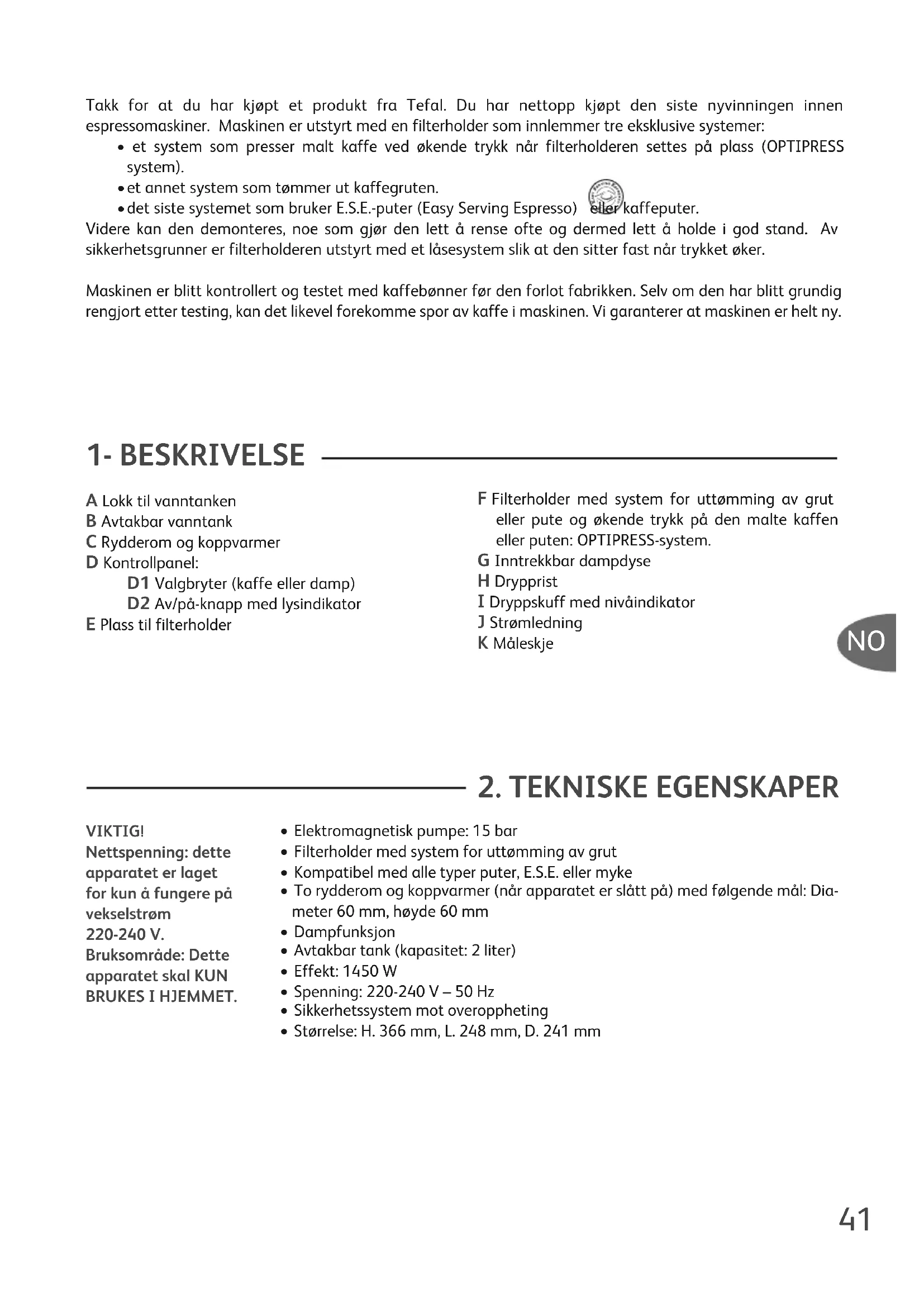 A Lokk til vanntanken B Avtakbar vanntank C Rydderom og koppvarmer D Kontrollpanel: D1 Valgbryter (kaffe eller damp) D2 Av/på-knapp med lysindikator E Plass til filterholder F Filterholder med system for uttømming av grut eller pute og økende trykk på den malte kaffen eller puten: OPTIPRESS-system. G Inntrekkbar dampdyse H Drypprist I Dryppskuff med nivåindikator J Strømledning K Måleskje Takk for at du har kjøpt et produkt fra Tefal. Du har nettopp kjøpt den siste nyvinningen innen espressomaskiner. Maskinen er utstyrt med en filterholder som innlemmer tre eksklusive systemer: