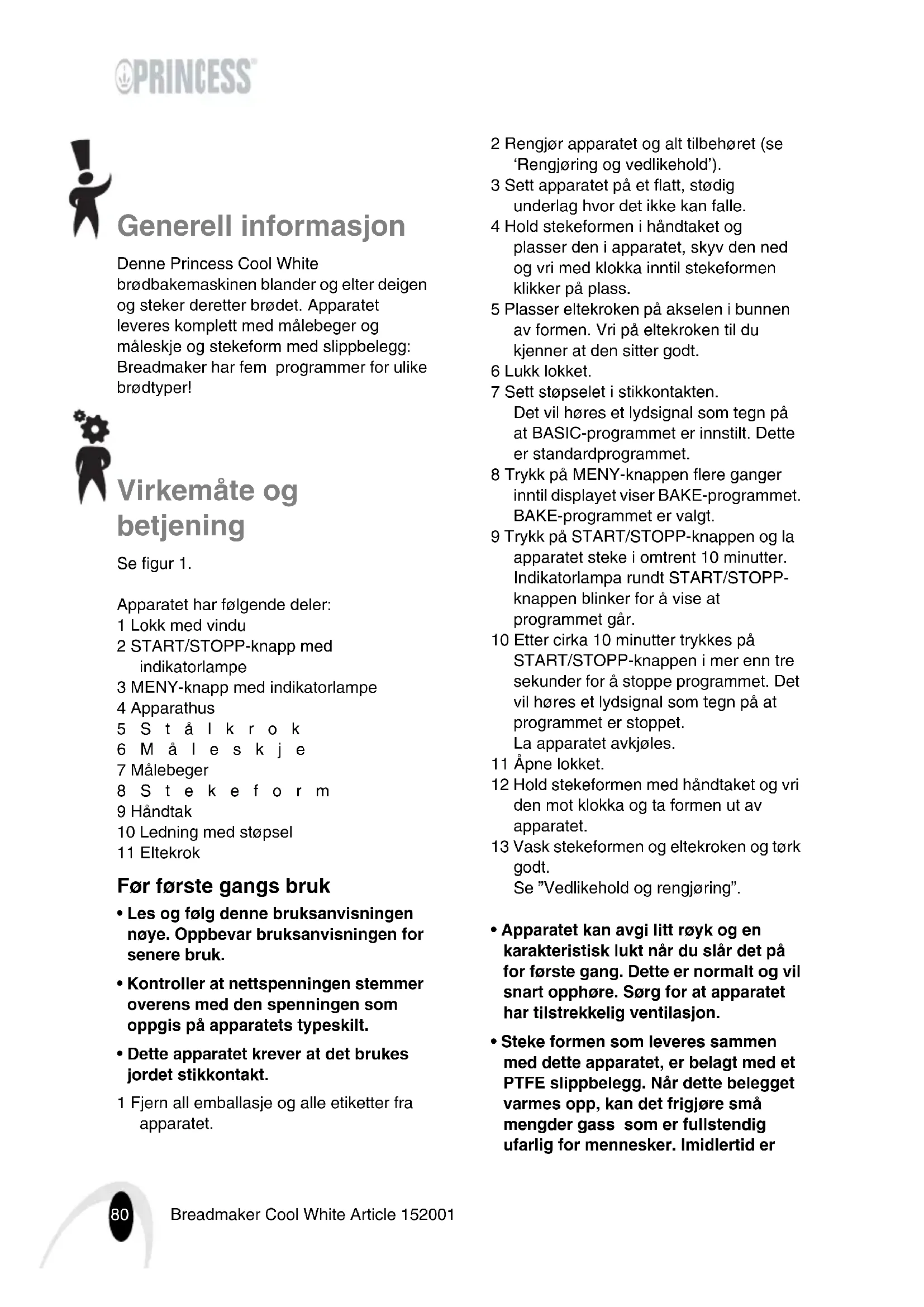 - Hvis dette apparatet brukes av barn eller personer med fysiske, sanselige, psykiske eller motoriske84 Breadmaker Cool White Article 152001 funksjonshemninger, eller personer med manglende kunnskap og erfaring, kan det føre til faresituasjoner. De som har ansvaret for sikkerheten til slike personer, må gi tydelige instruksjoner eller holde øye med bruken av apparatet.