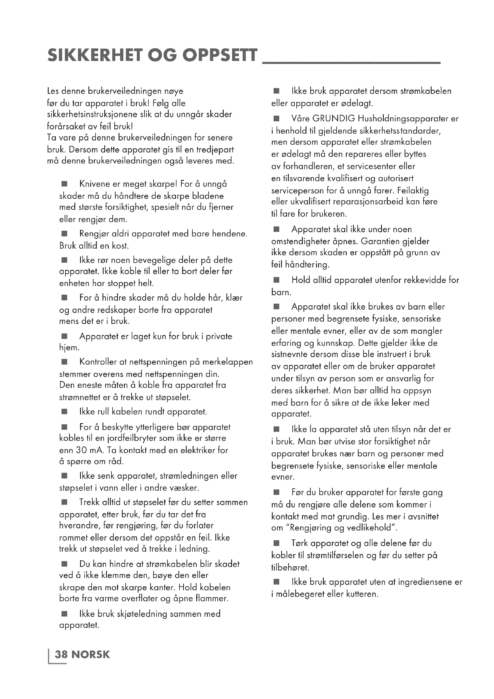 Les denne brukerveiledningen nøye før du tar apparatet i bruk! Følg alle sikkerhetsinstruksjonene slik at du unngår skader forårsaket av feil bruk! Ta vare på denne brukerveiledningen for senere bruk. Dersom dette apparatet gis til en tredjepart må denne brukerveiledningen også leveres med. Knivene er meget skarpe! For å unngå skader må du håndtere de skarpe bladene med størst e forsiktighet, spesielt når du fjerner eller rengjør dem. Rengjør aldri apparatet med bare hendene. Bruk alltid en kost. Ikke rør noen bevegelige deler på dette apparatet. Ikke koble til eller ta bort deler før enheten har stoppet helt. For å hindre skader må du holde hår, klær og andre redskaper borte fra apparatet mens det er i bruk. Apparatet er laget kun for bruk i private hjem. Kontroller at nettspenningen på merkelappen stemmer overens med nettspenningen din. Den eneste måten å koble fra apparatet fra strømnettet er å trekke ut støpselet. Ikke rull kabelen rundt apparatet. For å beskytte ytterligere bør apparatet kobles til en jordfeilbryter som ikke er større enn 30 mA. Ta kontakt med en elektriker for å spørre om råd. Ikke senk apparatet, strømledningen eller støpselet i vann eller i andre væsker. Trekk alltid ut støpselet før du setter sammen apparatet, etter bruk, før du tar det fra hverandre, før rengjøring, før du forlater rommet eller dersom det oppstår en feil. Ikke trekk ut støpselet ved å trekke i ledning. Du kan hindre at strømkabelen blir skadet ved å ikke klemme den, bøye den eller skrape den mot skarpe kanter. Hold kabelen borte fra varme overflater og åpne flammer. Ikke bruk skjøteledning sammen med apparatet. Ikke bruk apparatet dersom strømkabelen eller apparatet er ødelagt. Våre GRUNDIG Husholdningsapparater er i henhold til gjeldende sikkerhetss tandarder, men dersom apparatet eller strømkabelen er ødelagt må den repareres eller byttes av forhandleren, et servicesenter eller en tilsvarende kvalifisert og autorisert serviceperson for å unngå farer. Feilaktig eller ukvalifisert reparasjonsarbeid kan føre til fare for brukeren. Apparatet skal ikke under noen omstendigheter åpnes. Garantien gjelder ikke dersom skaden er oppstått på grunn av feil håndter ing. Hold alltid apparatet utenfor rekkevidde for barn. Apparatet skal ikke brukes av barn eller personer med begrensete fysiske, sensoriske eller mentale evner, eller av de som mangler erfaring og kunnskap. Dette gjelder ikke de sistnevnte dersom disse ble instruert i bruk av apparatet eller om de bruker apparatet under tilsyn av person som er ansvarlig for deres sikkerhet. Man bør alltid ha oppsyn med barn for å sikre at de ikke leker med apparatet. Ikke la apparatet stå uten tilsyn når det er i bruk. Man bør utvise stor forsiktighet når apparatet brukes nær barn og personer med begrensete fysiske, sensoriske eller mentale evner. Før du bruker apparatet for første gang må du rengjøre alle delene som kommer i kontakt med mat grundig. Les mer i avsnittet om “Rengjøring og vedlikehold”. Tørk apparatet og alle delene før du kobler til strømtilførselen og før du setter på tilbehøret. Ikke bruk apparatet uten at ingrediensene er i målebegeret eller kutteren. 38NORSK Sett aldri apparatet, tilbehøret, kabelen eller støpselet på en varm overflate som en gass brenner, elektrisk brenner, varmeovn eller varme væsker og mat. La varm mat og væsker kjøle seg ned til min. 80°C eller mindre før bruk. Bruk bare medfølgende deler når du bruker apparatet. Ikke la apparatet være på lenger enn du trenger for å behandle maten. Ikk e bruk apparatet til annet enn til det det er tiltenkt. Bruk bare medfølgende deler når du bruker apparatet. Apparatet er kun laget for å behandle mengder som er vanlig i en husholdning. Ikke bruk apparatet dersom bladene er ødelagt eller viser tegn til slitasje. Apparatet skal bare brukes på et stabilt, flatt, rent, tørt underlag. Pass på at der ikke er fare for at noen kan trekke i ledningen ved et uhell eller at noen kan snuble i den mens apparatet er i bruk. Plasser apparatet slik at kontakten alltid er tilgjengelig. Man kan bruke en slikkepott til å fjerne mat fra målebegeret eller kuttebollen. Før man gjør dette må apparatet være helt avslått. Apparatet er ikke egnet til å knuse is eller til tørr eller hard mat. Det vil føre til at bladene blir sløve. Ta ut bein og steiner fra mat for å hindre at bladene eller apparatet blir ødelagt. For å redusere faren for skade må du ikke montere bladene til kutteren på hovedenheten dersom k utteren ikke sitter skikkelig fast. Pass på at lokket på kutteren sitter skikkelig før du starter apparatet. Apparatet bør ikke br ukes mer enn i 15 sekunder dersom det ikke jobber med noe Dette apparatet er ment å brukes i korte perioder og bør ikke brukes mer enn i 1 minutt (stavmikser eller kutter) eller 3 minutter (visp) om gangen. La apparatet kjøle seg tilstrekkelig ned etter bruk.